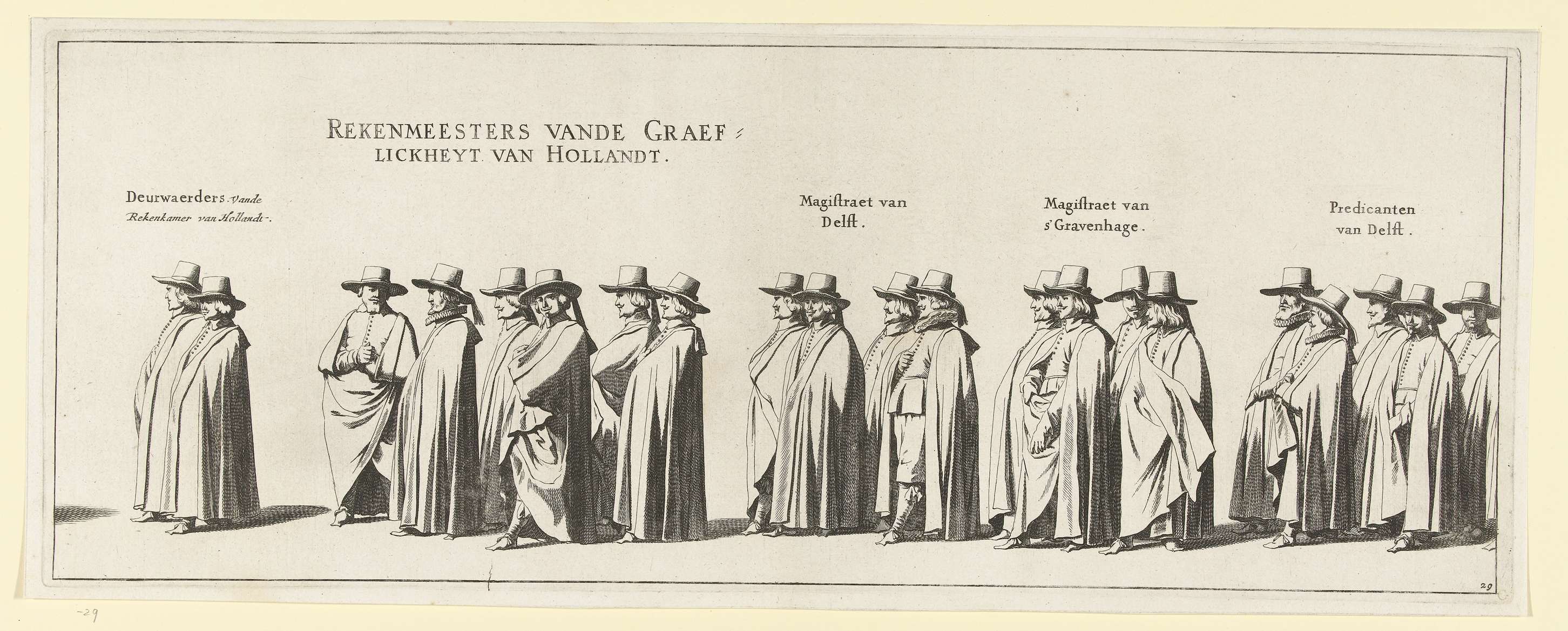 De begrafenisstoet van stadhouder Frederik Hendrik te 's-Gravenhage op 10 mei 1647. Plaat nr. 29 met een deel van de stoet met rekenmeesters en vertegenwoordigers en predikanten van verschillende steden, boven de personen staat hun functie. Onderdeel van een serie van 30 platen en 20 tekstbladen, bedoeld om aan elkaar geplakt te worden.