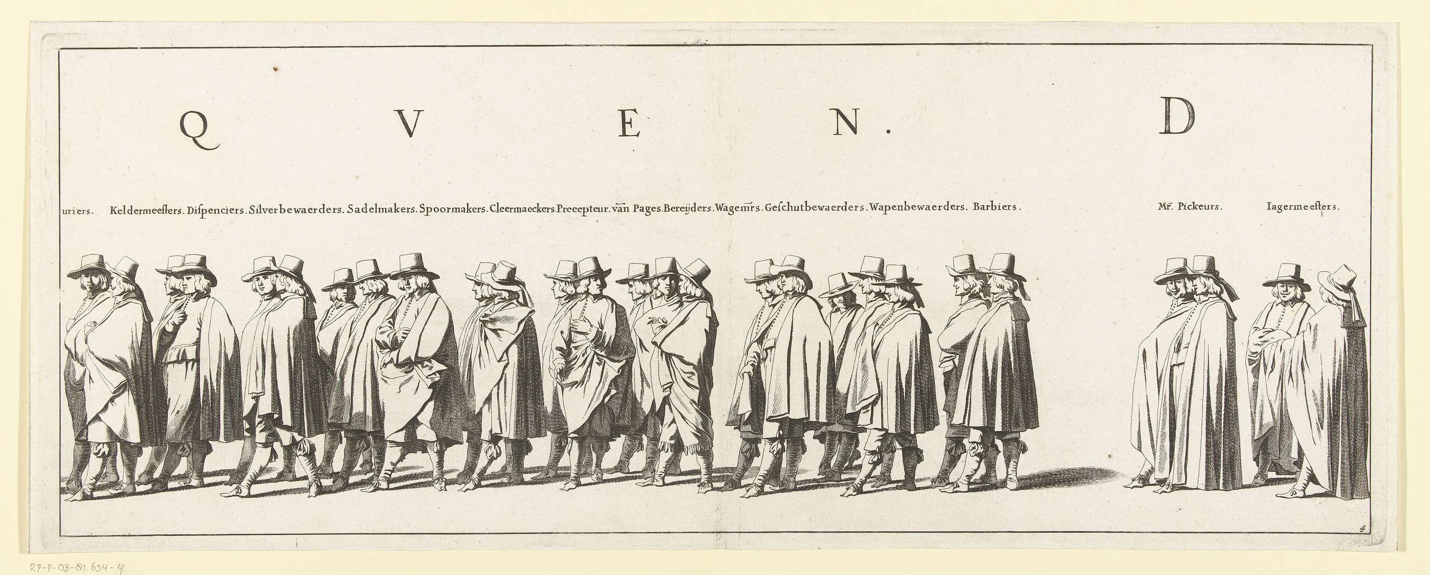 De begrafenisstoet van stadhouder Frederik Hendrik te 's-Gravenhage op 10 mei 1647. Plaat nr. 4 met een deel van de stoet, boven de personen staat hun functie. Onderdeel van een serie van 30 platen en 20 tekstbladen, bedoeld om aan elkaar geplakt te worden.
