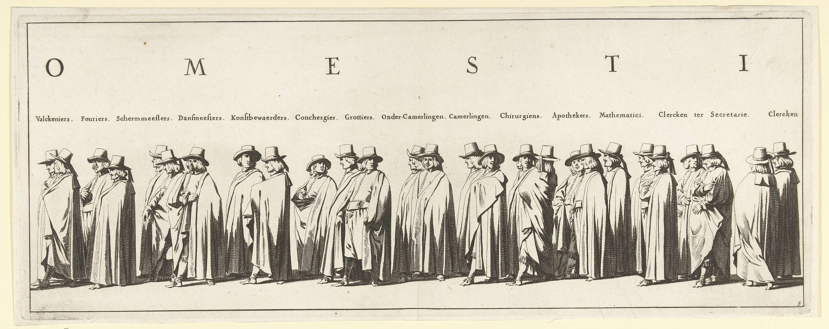 De begrafenisstoet van stadhouder Frederik Hendrik te 's-Gravenhage op 10 mei 1647. Plaat nr. 5 met een deel van de stoet, boven de personen staat hun functie. Onderdeel van een serie van 30 platen en 20 tekstbladen, bedoeld om aan elkaar geplakt te worden.