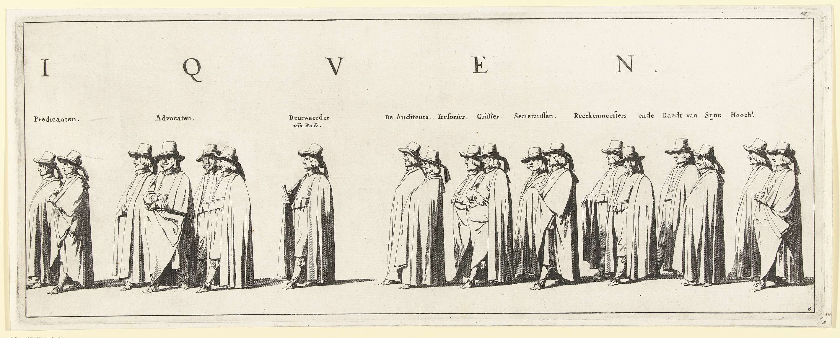 De begrafenisstoet van stadhouder Frederik Hendrik te 's-Gravenhage op 10 mei 1647. Plaat nr. 8 met een deel van de stoet, boven de personen staat hun functie. Onderdeel van een serie van 30 platen en 20 tekstbladen, bedoeld om aan elkaar geplakt te worden.