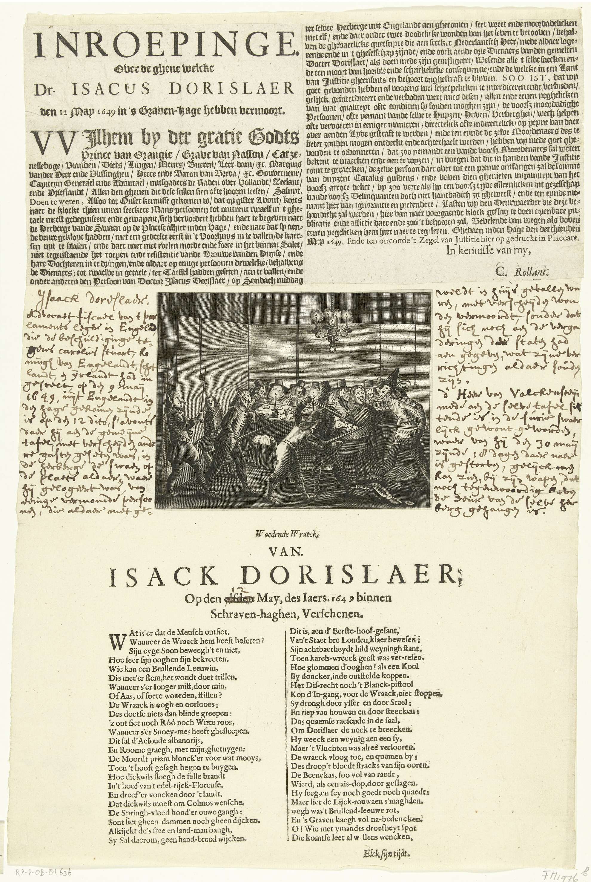 De prent en vers van de moord gepleegd op Isaäc Dorislaer door een groep gemaskerde mannen in herberg De Zwaan op de Plaats te 's-Gravenhage, 12 mei 1649, gecombineerd op een blad met de bekendmaking van de uitgeloofde beloning van duizend gulden voor het aanwijzen van de moordenaars van Isaäc Doreslaer. Doreslaer was als gezant ...