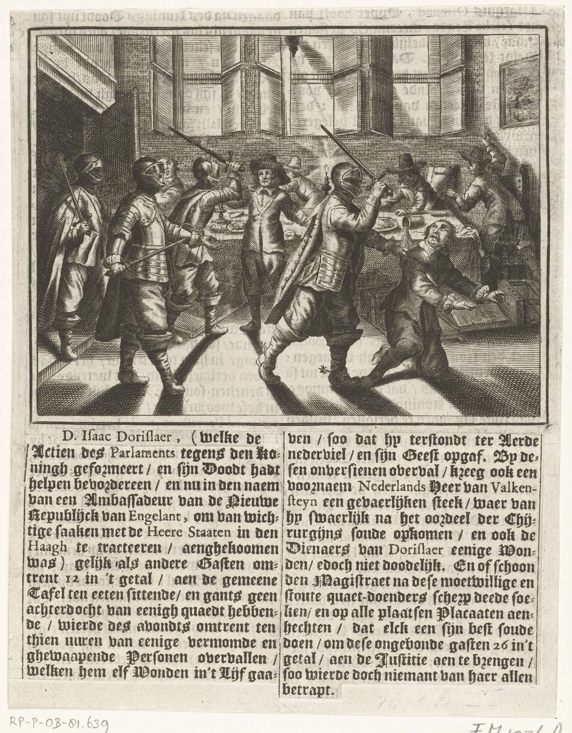 De moord gepleegd op de Engelse gezant Isaäc Doreslaer door een groep gemaskerde mannen in herberg De Zwaan op de Plaats te 's-Gravenhage, 12 mei 1649. Onder de voorstelling is de relevante tekst uit het boek geplakt. Bedrukt op de achterzijde met tekst in het Nederlands.