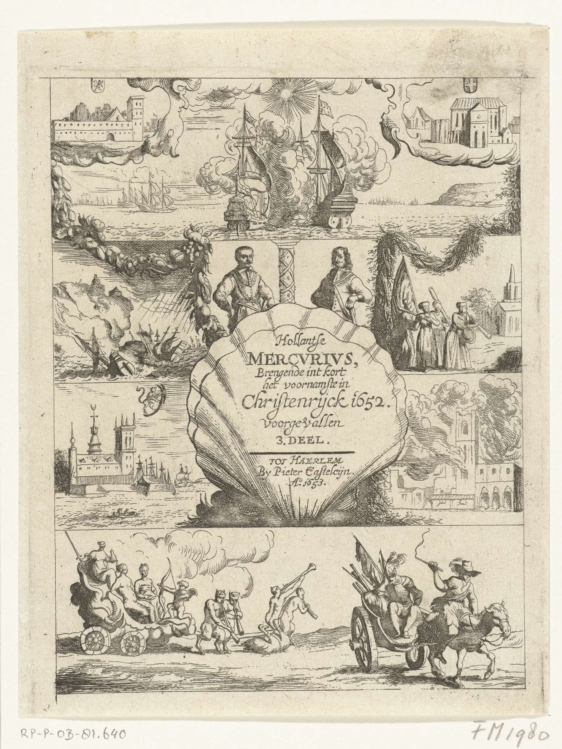 Titelprent voor de Hollantsche Mercurius (derde deel) van 1652. Vier stroken met in het klein de belangrijkste gebeurtenissen uit het jaar 1652, waaronder de Eerste Engelse Oorlog. Centraal een schelp met de titel.