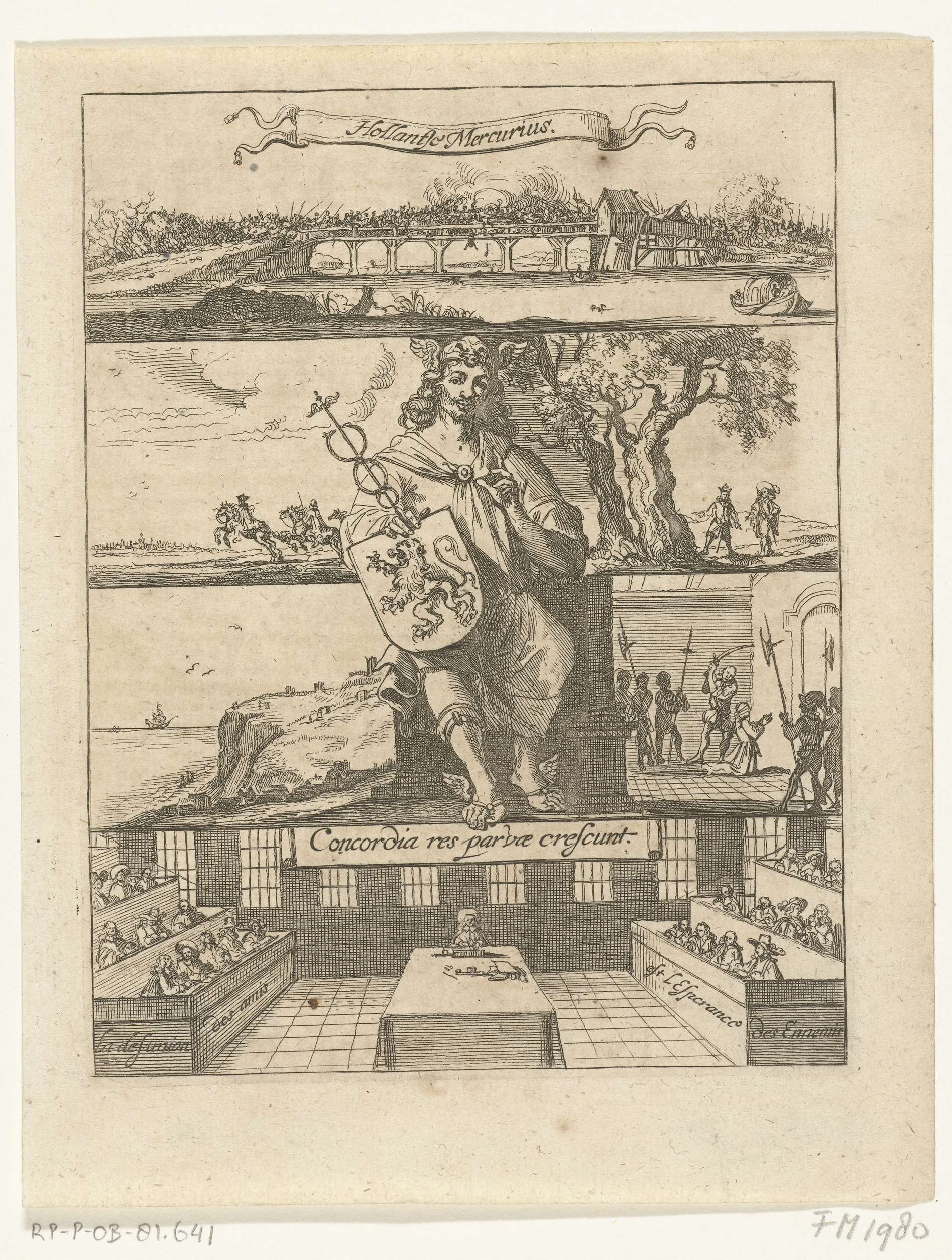 Titelprent voor de Hollantsche Mercurius van 1651. Vier stroken met in het klein de belangrijkste gebeurtenissen uit het jaar. Centraal de zittende Mercurius met wapenschild van Holland.