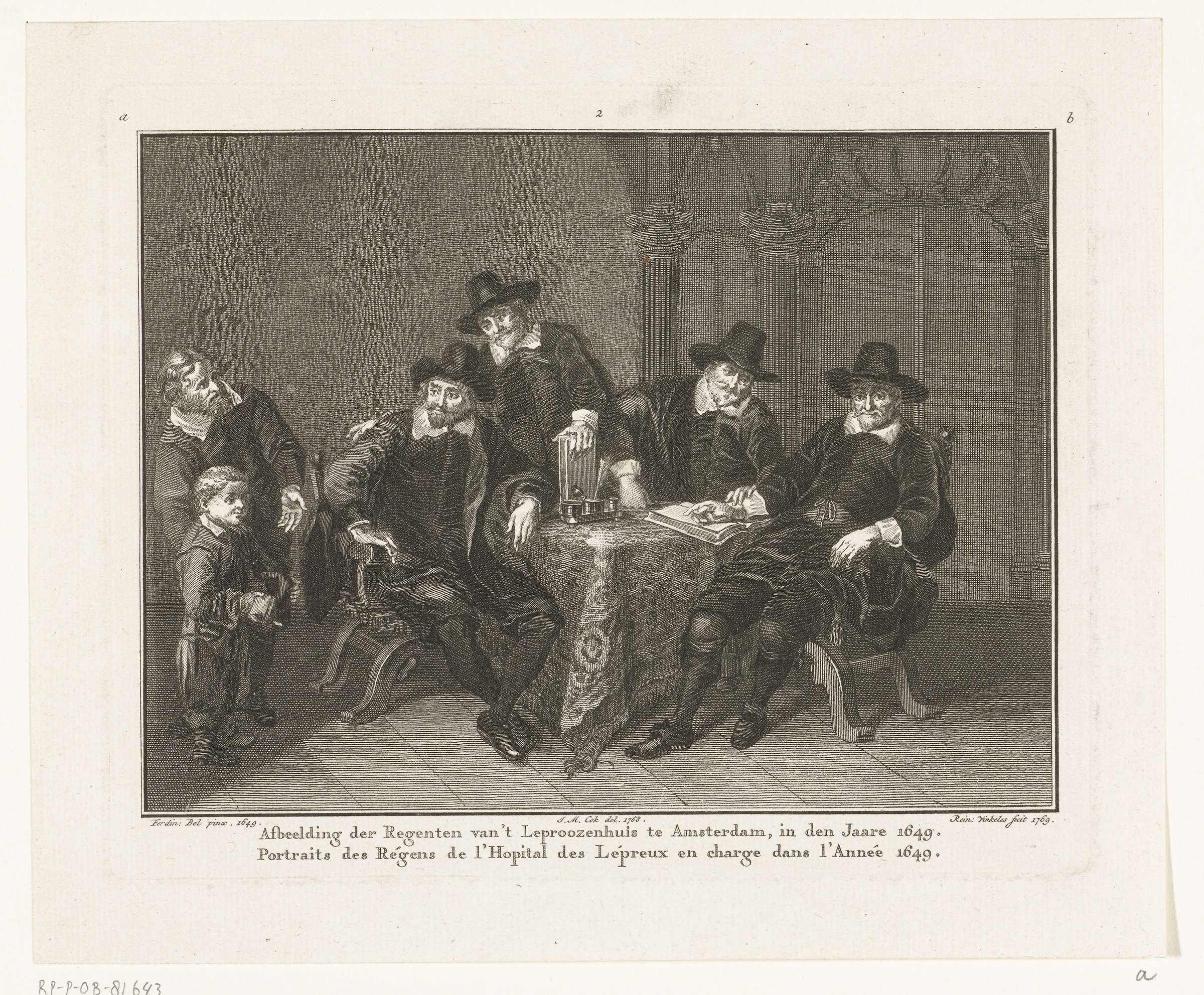 Groepsportret van de regenten van het Leprozenhuis, geschilderd door Ferdinand Bol in 1649. Een vergadering van de regenten wordt onderbroken door de binnenvader die een ziek kind binnen leidt.