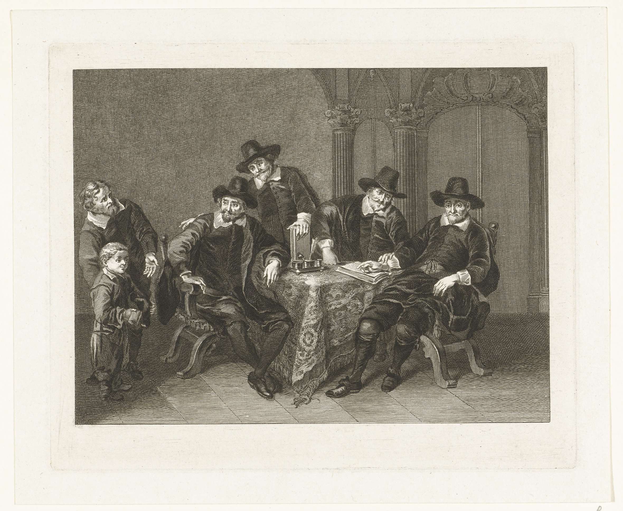Groepsportret van de regenten van het Leprozenhuis, geschilderd door Ferdinand Bol in 1649. Een vergadering van de regenten wordt onderbroken door de binnenvader die een ziek kind binnen leidt.
