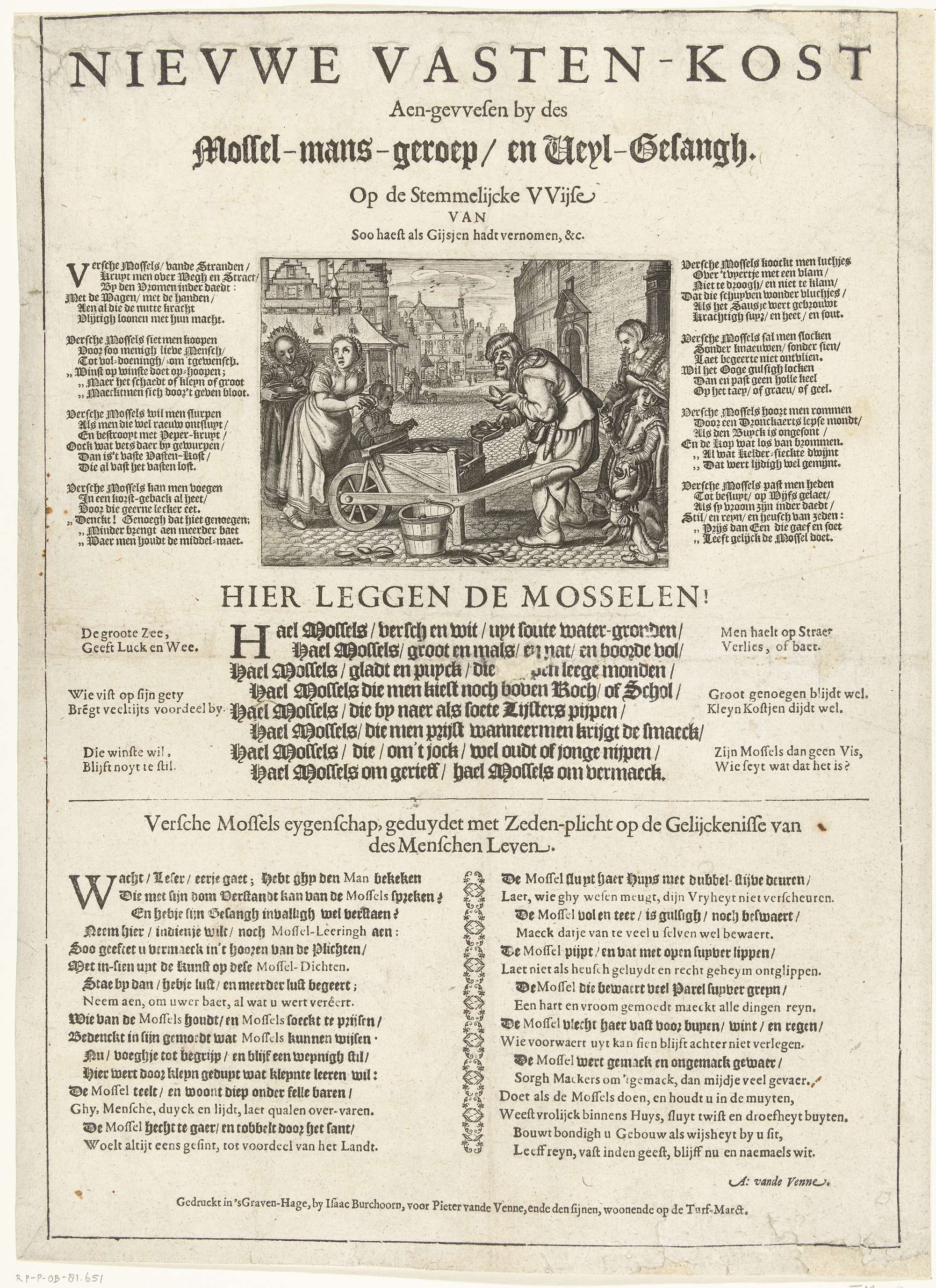 Mosselman, ca. 1625. Blad met een voorstelling van een mosselman die op een plein bij de abdij van Middelburg vanuit een kruiwagen mosselen verkoopt. Vrouwen staan in de rij om mosselen te kopen. Om de voorstelling verschillende verzen waarin de eigenschappen van de mossel worden geprezen en de mossel als voorbeeld voor de mens wordt ...