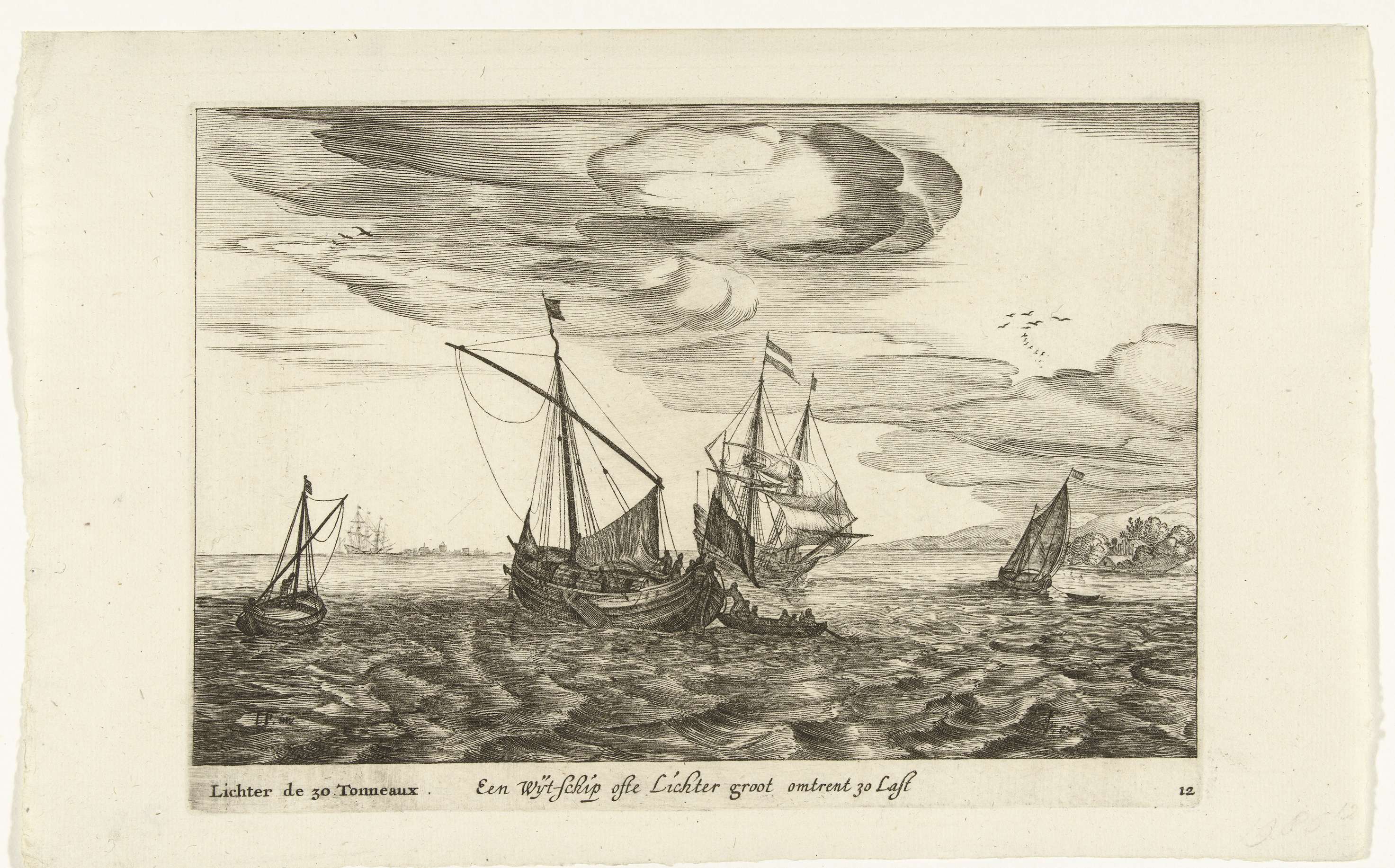 Een wijdschip of lichter op het water. Prent nr. 12 in een serie prenten van Hollandse scheepstypen, 1627. .