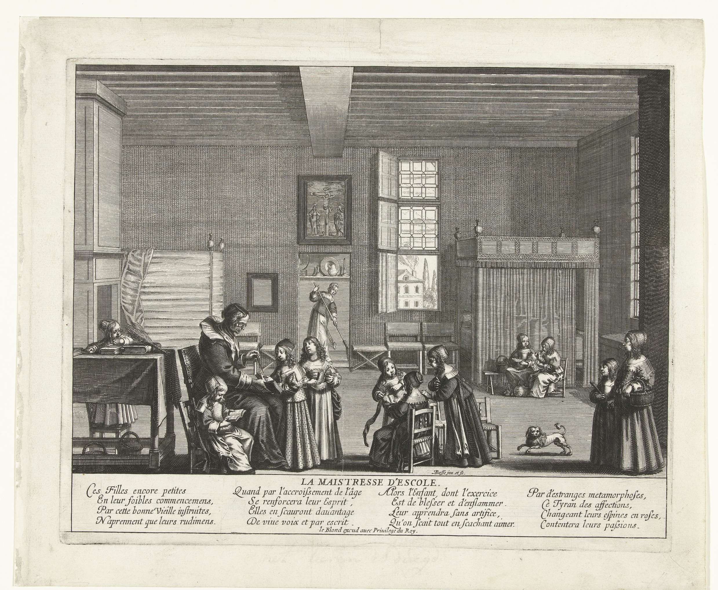 Een schoolvertrek waarin een schooljuffrouw aan meisjes onderwijs geeft. Op de achtergrond spelende meisjes en een meid die de vloer veegt. In het onderschrift 4 verzen van elk 4 regels in het Frans.