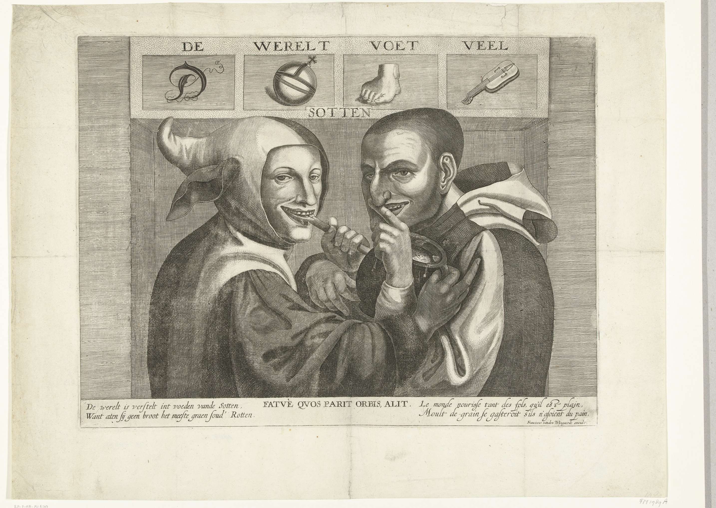 Allegorie op de dwaasheid van de wereld, ca. 1650. Twee narren, de linker likt een paplepel, de rechter veegt zijn neus. Het opschrift ook in de vorm van een rebus. In het onderschrift 2 verzen van 2 regels in het Nederlands en Frans en 1 regel Latijn.