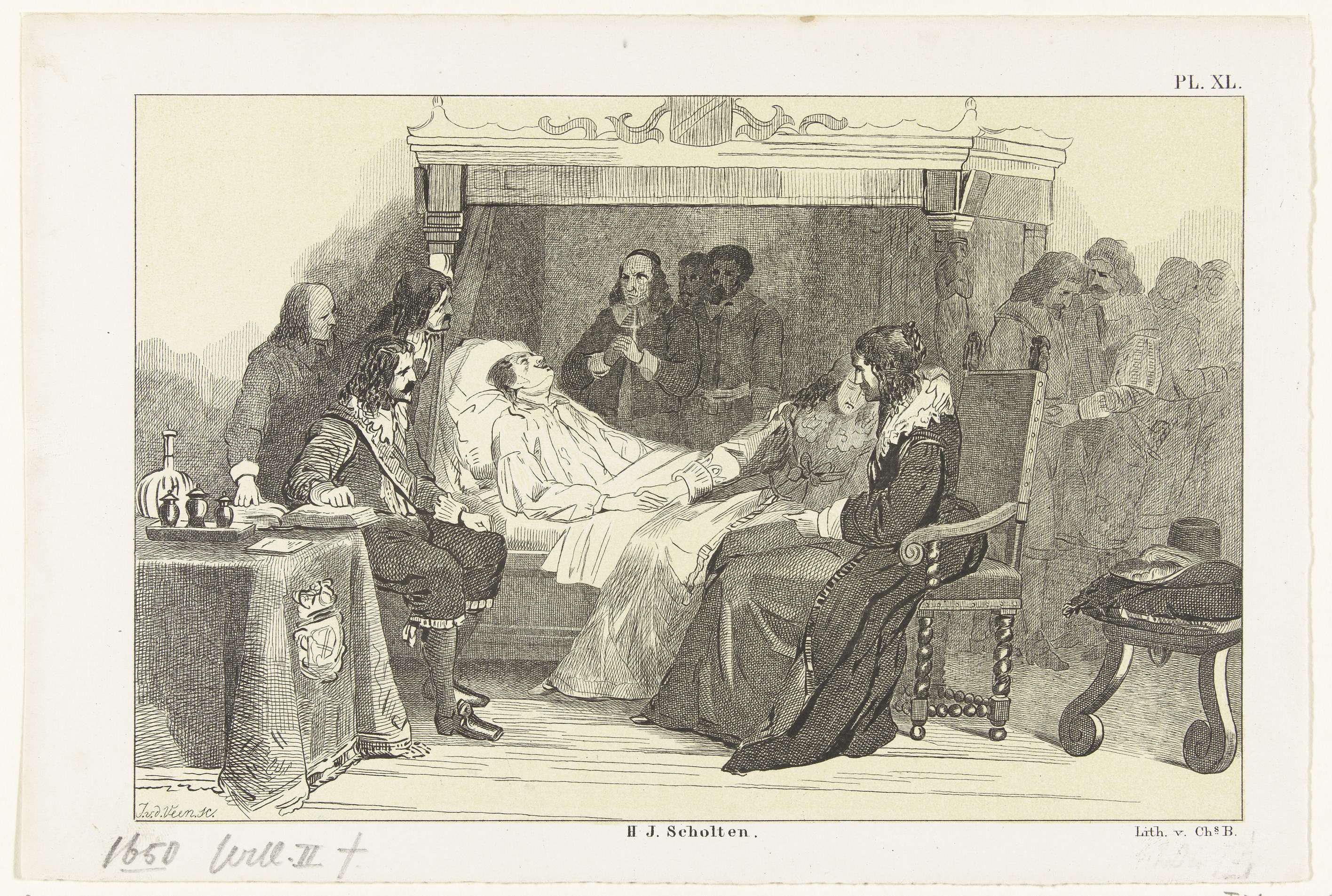Dood van prins Willem II, overleden op 6 november 1650. De prins op zijn sterfbed, omringd door familie en vrienden.