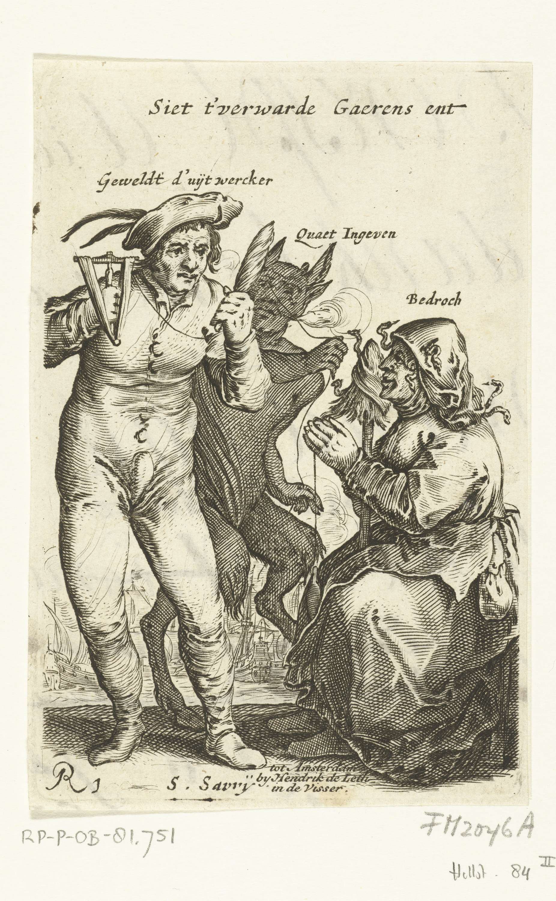 De duivel verwart het garen, 1652. Een zittende vrouw spint garen die door een man van een spoel op een haspel worden gewonden, achter hem staat de duivel die aan het garen trekt en het verwart en de man het kwaad ingeeft. De vrouw met slangen in het haar is hier aangeduid als Bedrog. Op ...