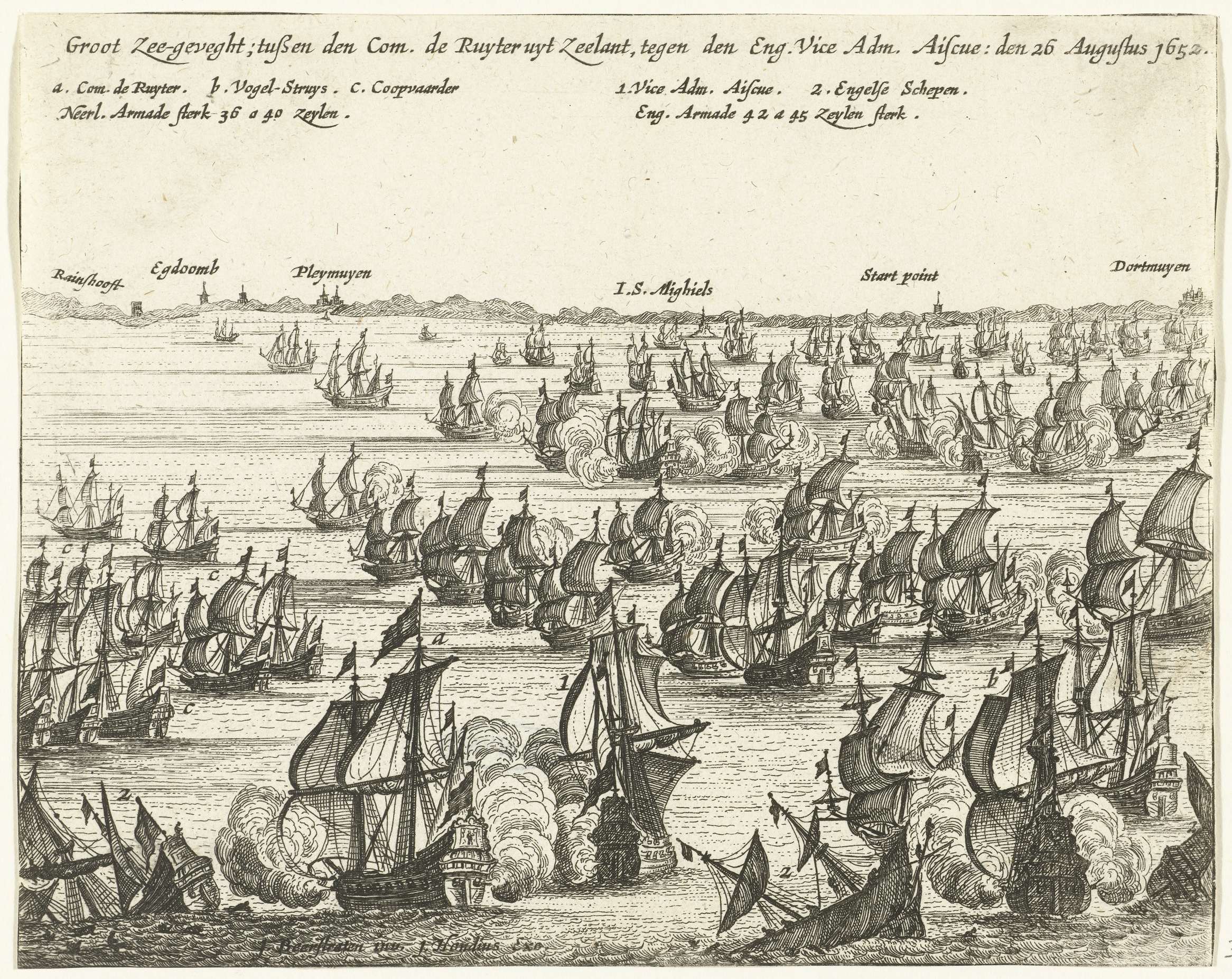 Zeeslag bij Plymouth in de Eerste Engelse Oorlog tussen de Staatse vloot onder Michiel Adriaenszoon de Ruyter en de Engelse vloot onder George Ayscue, 26 augustus 1652. Bovenaan de legenda a-c en 1-2. Ongenummerd [3].