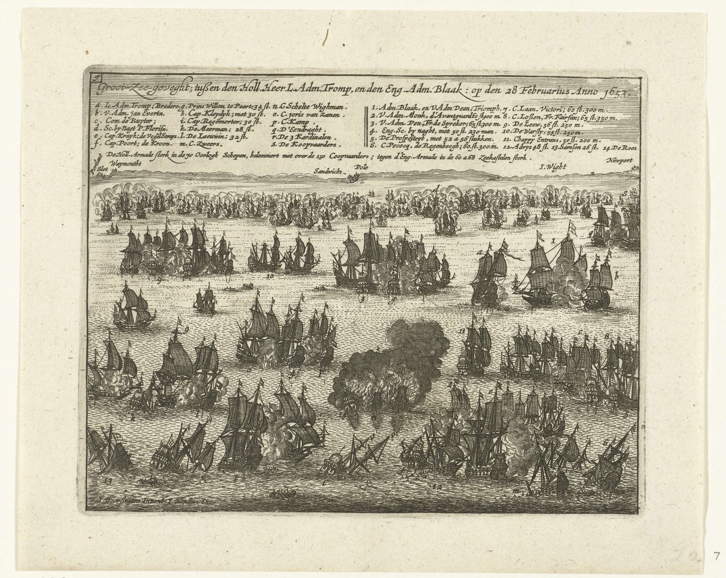 Driedaagse Zeeslag voor de Engelse zuidkust in de Eerste Engelse Oorlog tussen de Staatse vloot onder Maarten Tromp en de Engelse vloot onder Robert Blake, 28 februari 1653. Bovenaan de legenda a-s en 1-14. Genummerd linksboven: 7.