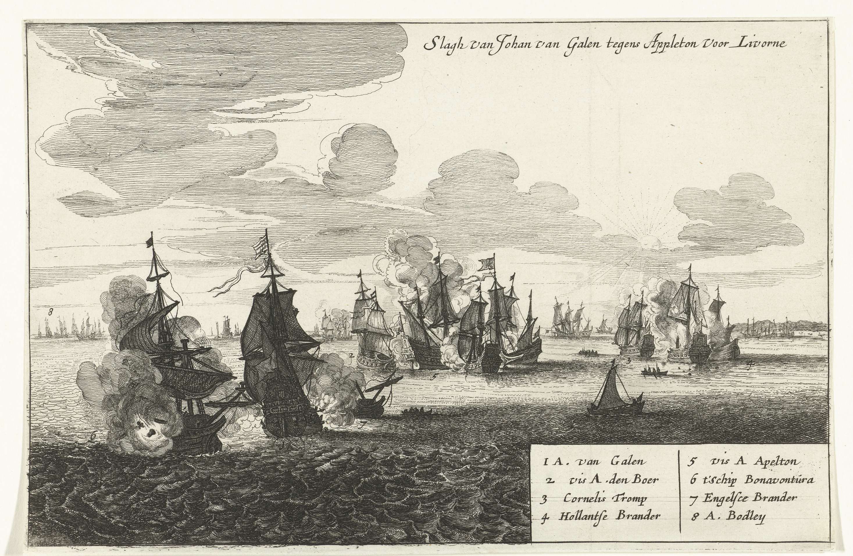 Zeeslag bij Livorno in de Eerste Engelse Oorlog tussen de Staatse vloot onder Johan van Galen en de Engelse vloot onder Henry Appleton en Richard Badiley, 14 maart 1653. Rechtsonder een cartouche met de legenda 1-8.