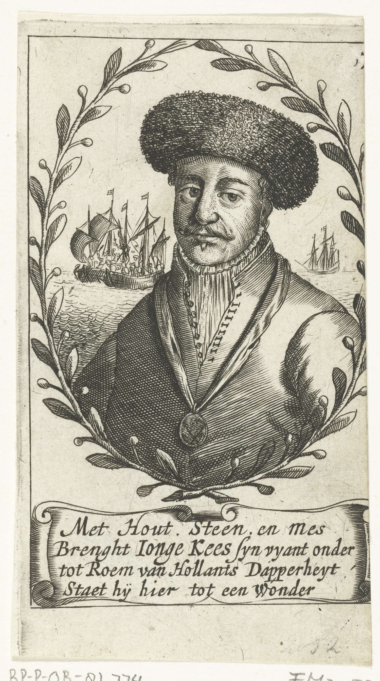 Portret van Jonge Kees, de visser van Vlieland die op 9 augustus 1652 een Engels vissersboot met bemanning gevangen nam. Portret in lauwerkrans, om de hals de medaille die hem door de Admiraliteit is verleend. Op de achtergrond het gevecht tussen de vissersschepen. Met vers van 4 regels. Het nummer rechtsboven deels weggekrabd.