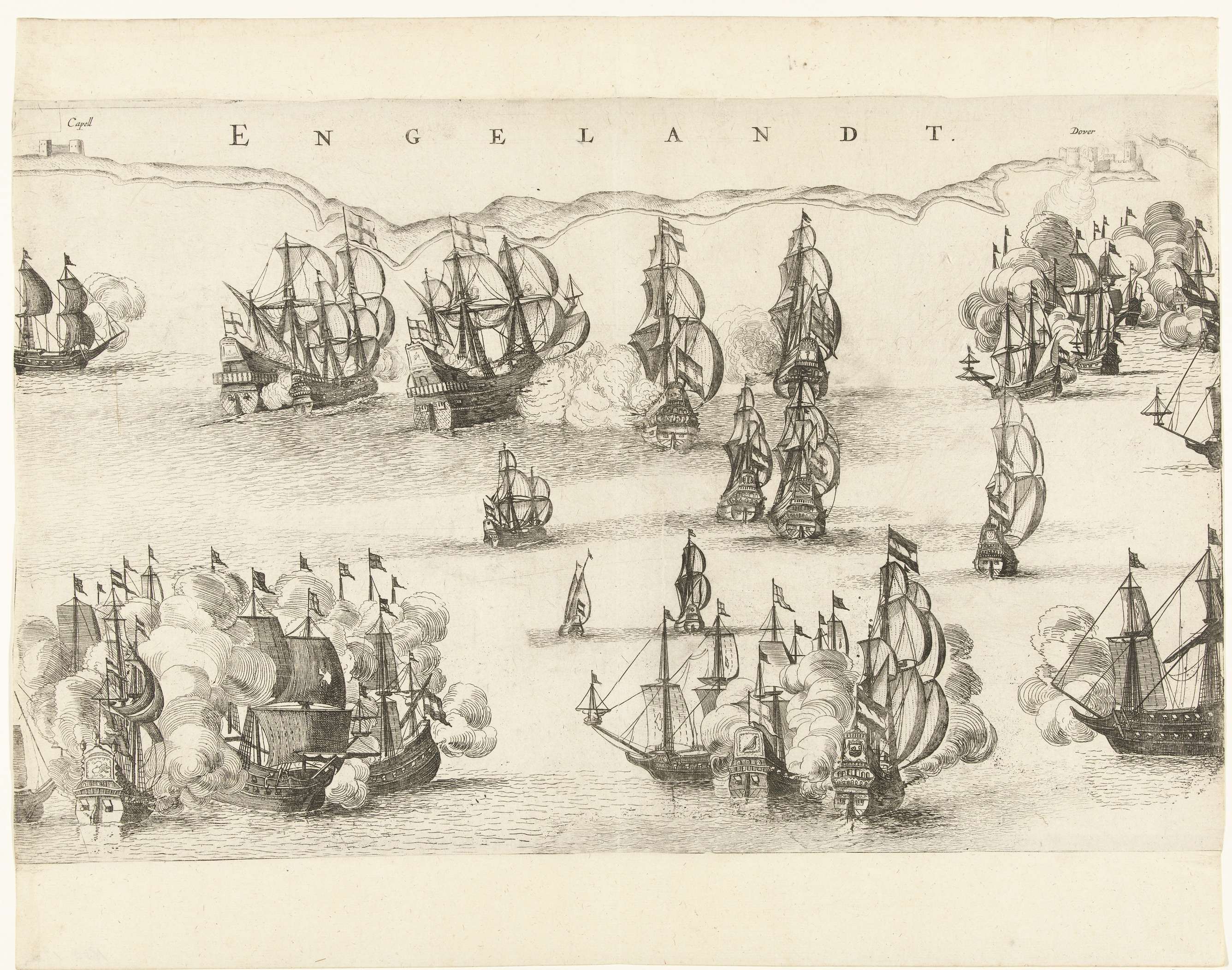 Zeeslag voor de Engelse kust bij Dover in de Eerste Engelse Oorlog tussen de Staatse vloot onder Maarten Tromp en de Engelse vloot onder Robert Blake, 29 mei 1652. Onderdeel van een grotere voorstelling.