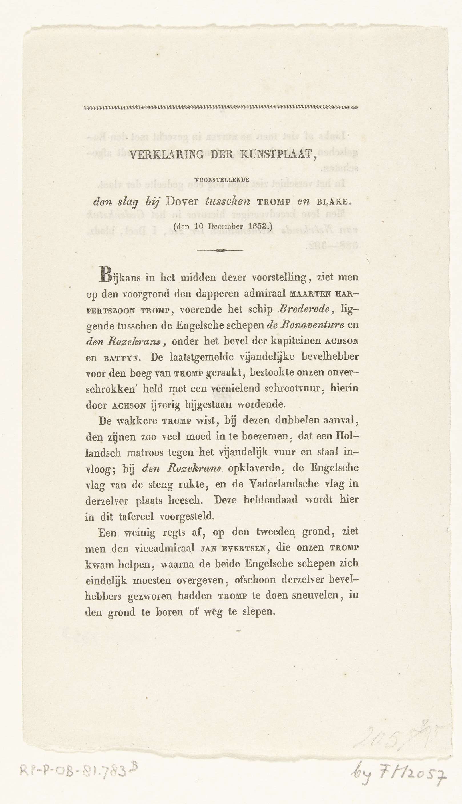 Tekstblad bij de prent van de zeeslag bij Dungeness (de Slag bij de Singels) voor de Engelse kust bij Dover in de Eerste Engelse Oorlog tussen de Staatse vloot onder Maarten Tromp en de Engelse vloot onder Robert Blake, 10 december 1652. Blad op beide zijden bedrukt.