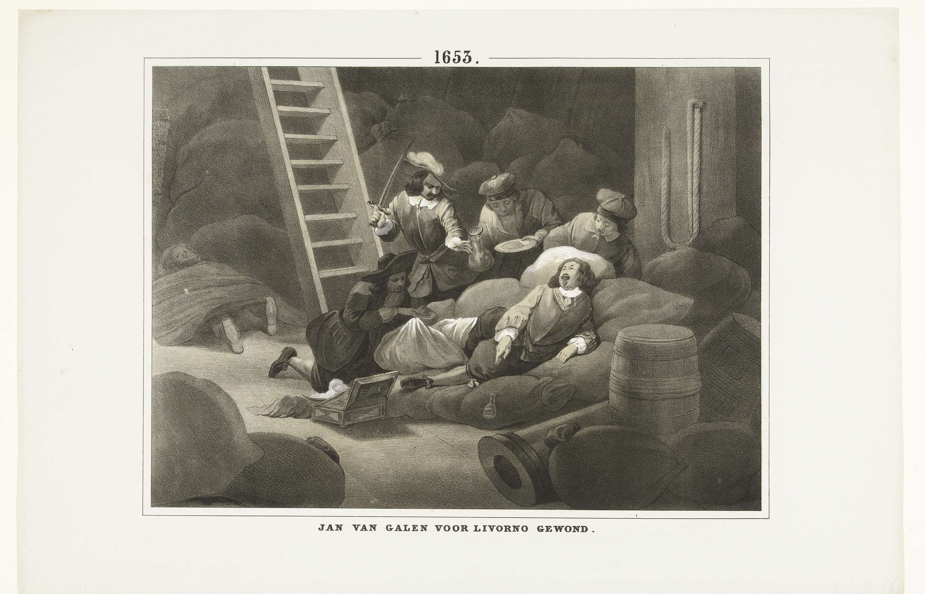 Johan van Galen raakt gewond in de zeeslag bij Livorno in de Eerste Engelse Oorlog tussen de Staatse vloot onder Johan van Galen en Cornelis Tromp en de Engelse vloot onder Henry Appleton en Richard Badiley, 14 maart 1653. In het ruim wordt het verbrijzelde been van de commandant door de scheepsarts verbonden.