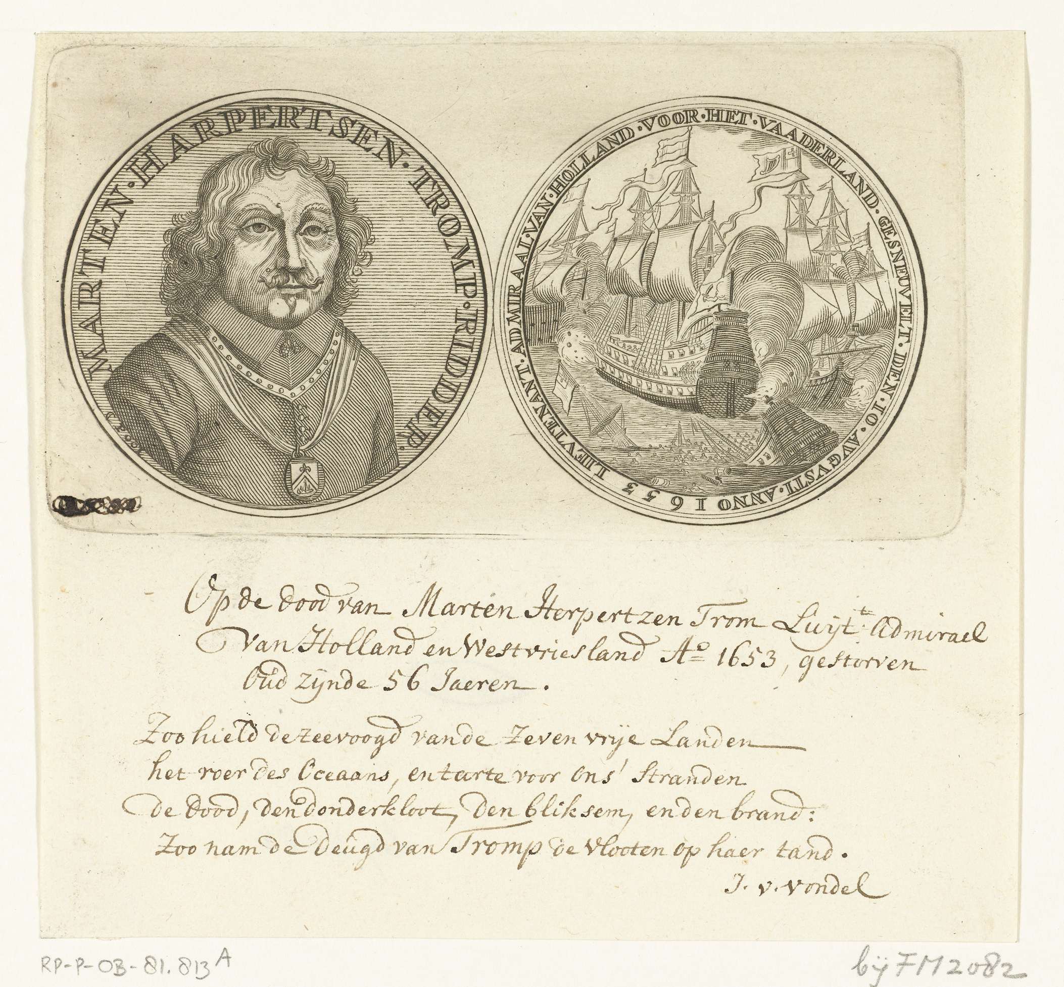 Penning ter ere van admiraal Maarten Tromp, gesneuveld in de zeeslag bij Terheide op 10 augustus 1653. Zilveren penning. Voorzijde: portret van Tromp binnen omschrift. Keerzijde: Zeeslag bij Terheide binnen omschrift. Onder de plaat een afschrift van een gedicht van Vondel op de dood van Tromp.