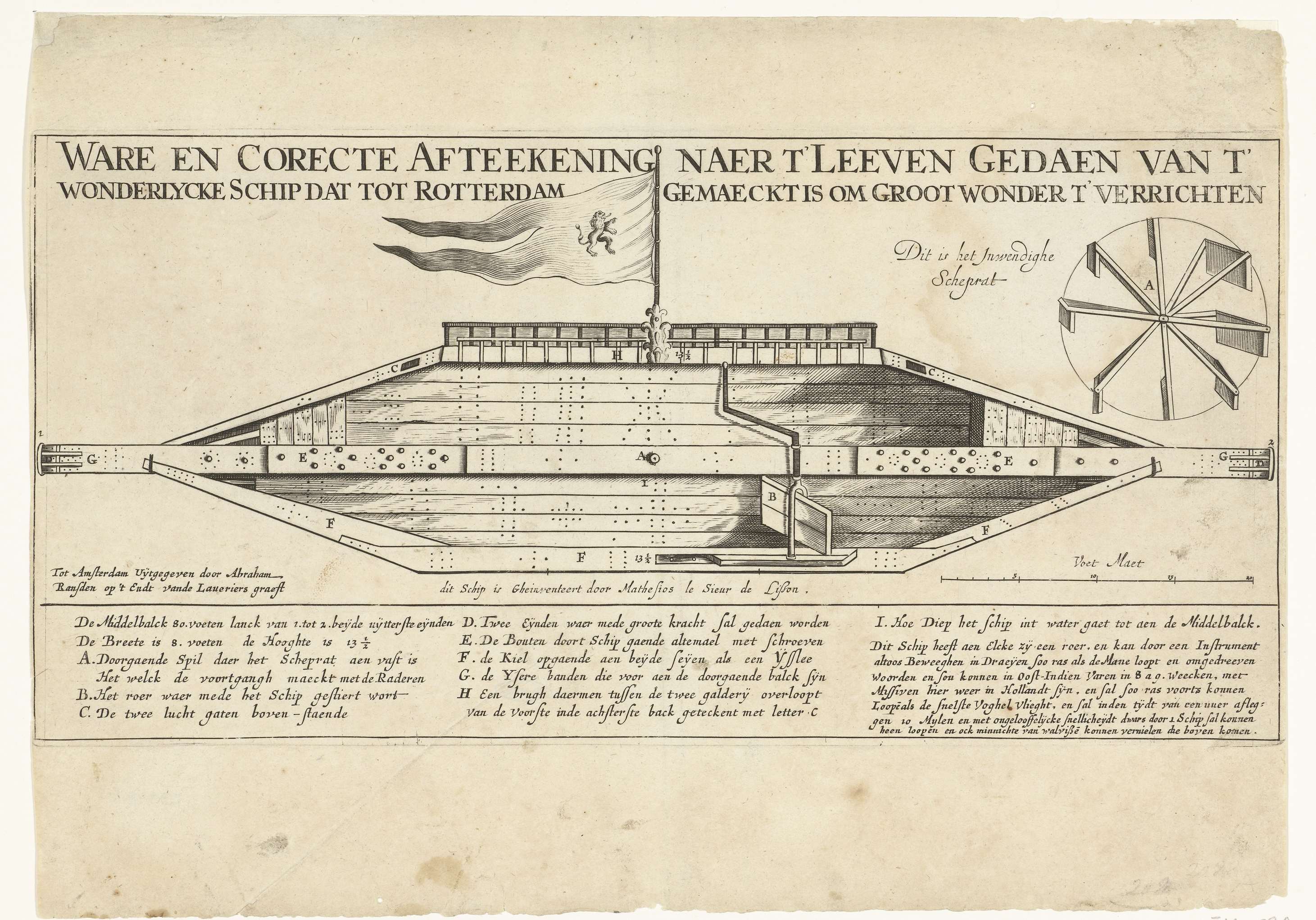 Het malle of wonderlijke schip van Rotterdam, ontworpen door Jean Duson (vermeld op deze prent als Mathesios le Sieur de Lisson), 1653. Dichtgetimmerd ruitvormig houten schip met in het midden een scheprad of schroef, bovenop het schip een vlag. In het onderschrift de legenda A-I.