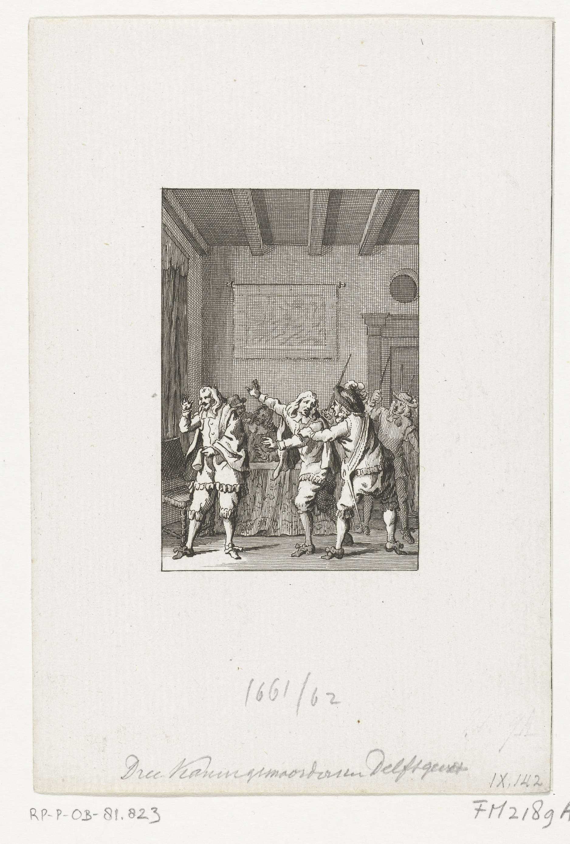 De arrestatie in Delft van drie gevluchte Engelse 'koningsmoordernaars' uit de tijd van Cromwell. Drie van de rechters die koning Karel I in 1649 ter dood hadden veroordeeld, hadden in Delft onderdak gevonden maar werden op verzoek van de Engelse regering opgepakt en uitgeleverd.