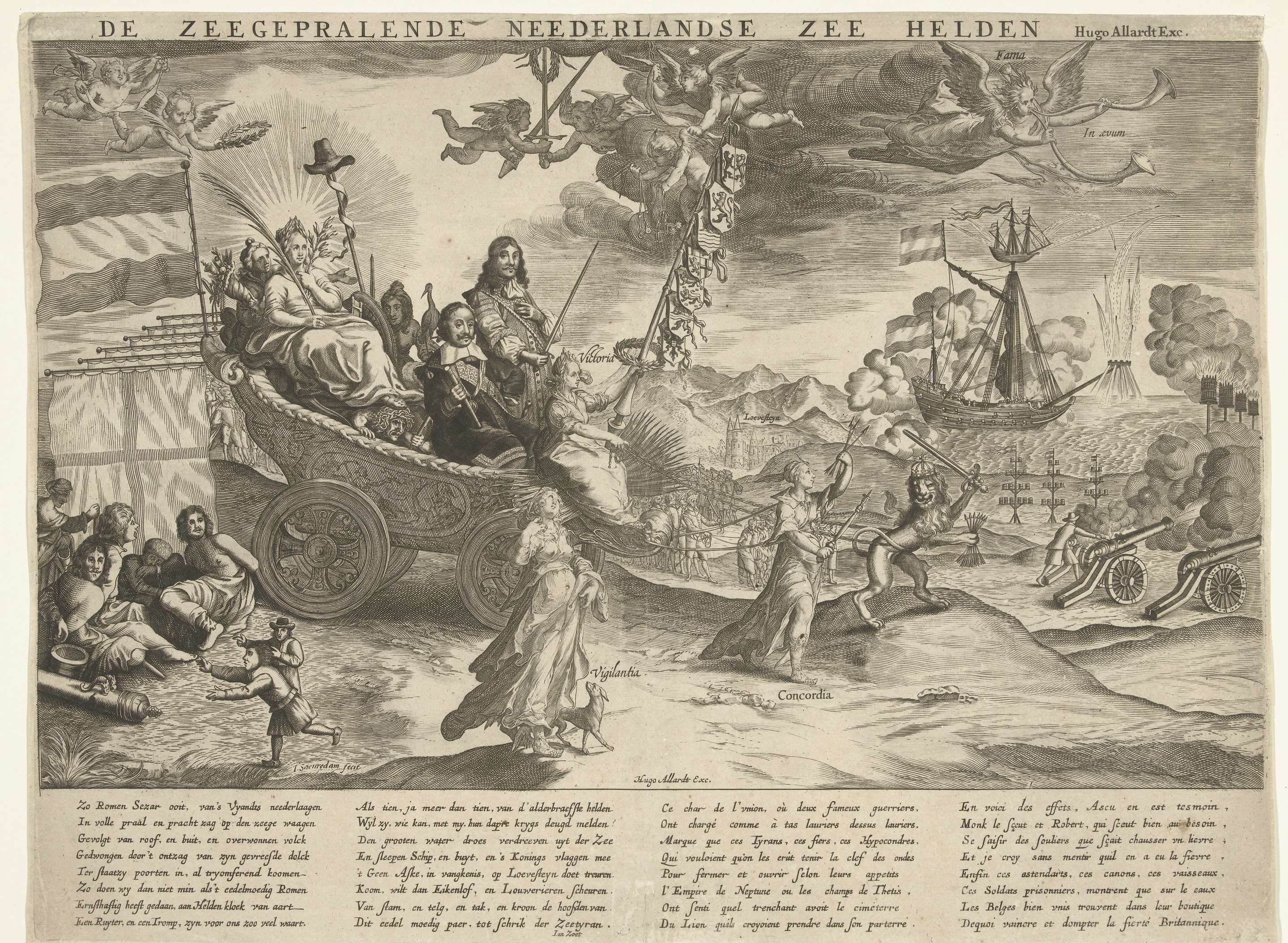 Allegorie op de Nederlandse overwinningen op zee tijdens de Eerste Engelse Oorlog, 1654. Triomfwagen met de Nederlandse gezagvoerders ter zee Cornelis Tromp en Michiel Adriaenszoon de Ruyter. De wagen wordt getrokken door de Nederlandse Leeuw en de personificatie van Eendracht (Concordia), Waakzaamheid (Vigilantia) loopt ernaast. Overwinning (Victoria) zit op de bok van de wagen met ...
