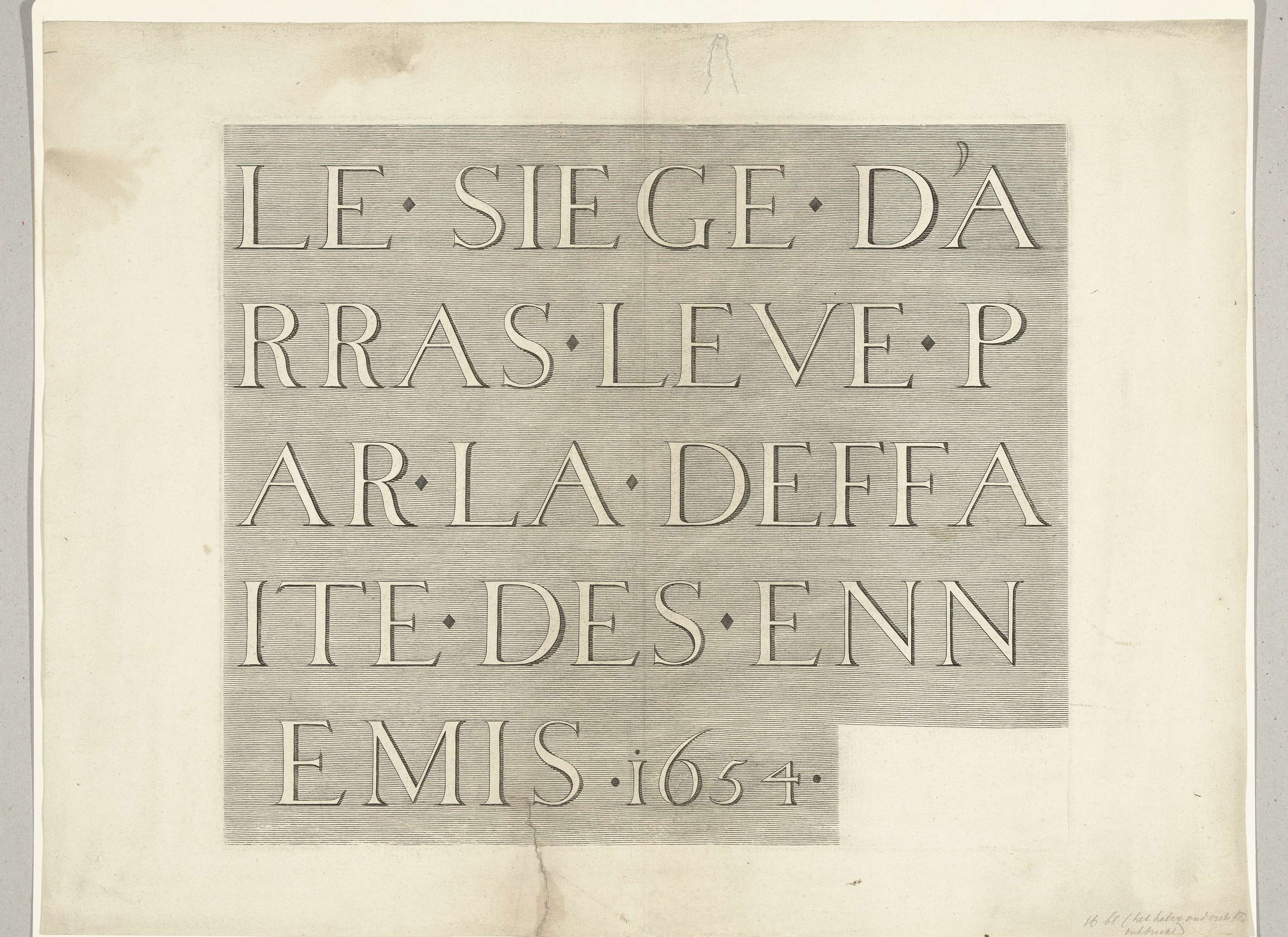 Ontzet van de stad Arras (Atrecht), belegerd door de Spanjaarden, 23-25 augustus 1654. Arras ontzet door het Franse leger onder de maarschalk Turenne van het beleg door de Spanjaarden onder Louis de Condé en aartshertog Leopold Willem. Blad met de titel in grote kapitalen in vijf onversneden stroken. Onderdeel van een ongemonteerd geheel bestaande uit ...