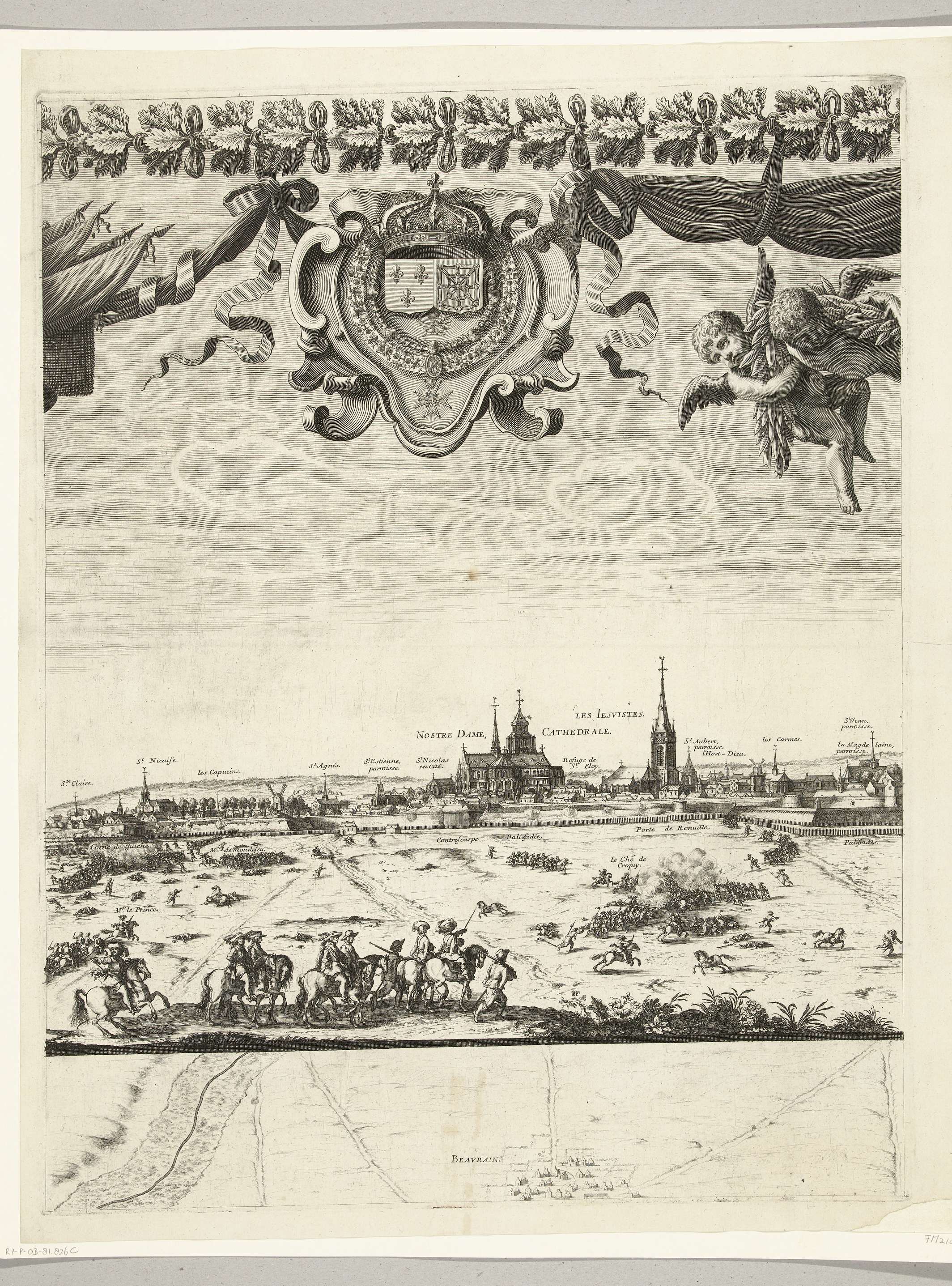 Ontzet van de stad Arras (Atrecht), belegerd door de Spanjaarden, 23-25 augustus 1654. Arras ontzet door het Franse leger onder de maarschalk Turenne van het beleg door de Spanjaarden onder Louis de Condé en aartshertog Leopold Willem. Tweede blad in de bovenste rij. Boven een wapen en putti, onder een deel van het profiel van ...