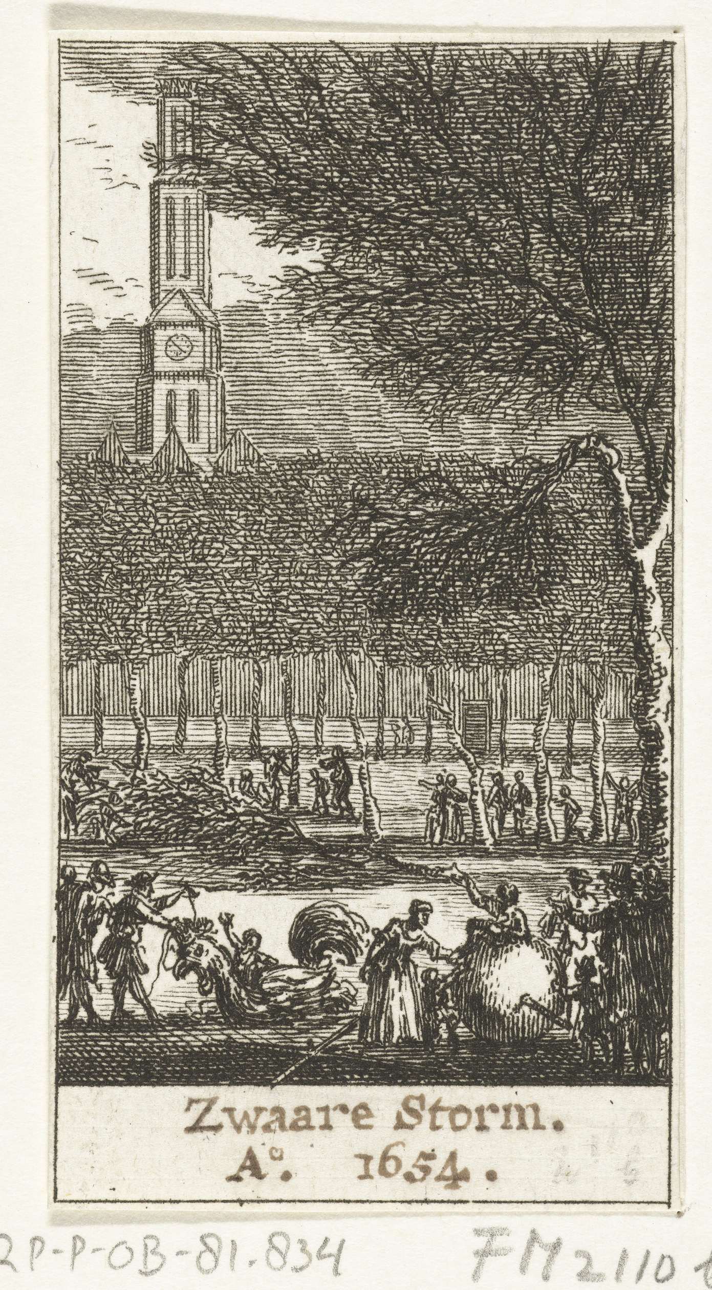 Zware in storm in een stad, waarschijnlijk Amsterdam. Takken van bomen en haan en bol van kerktoren afgewaaid. Genummerd bovenaan: 44.