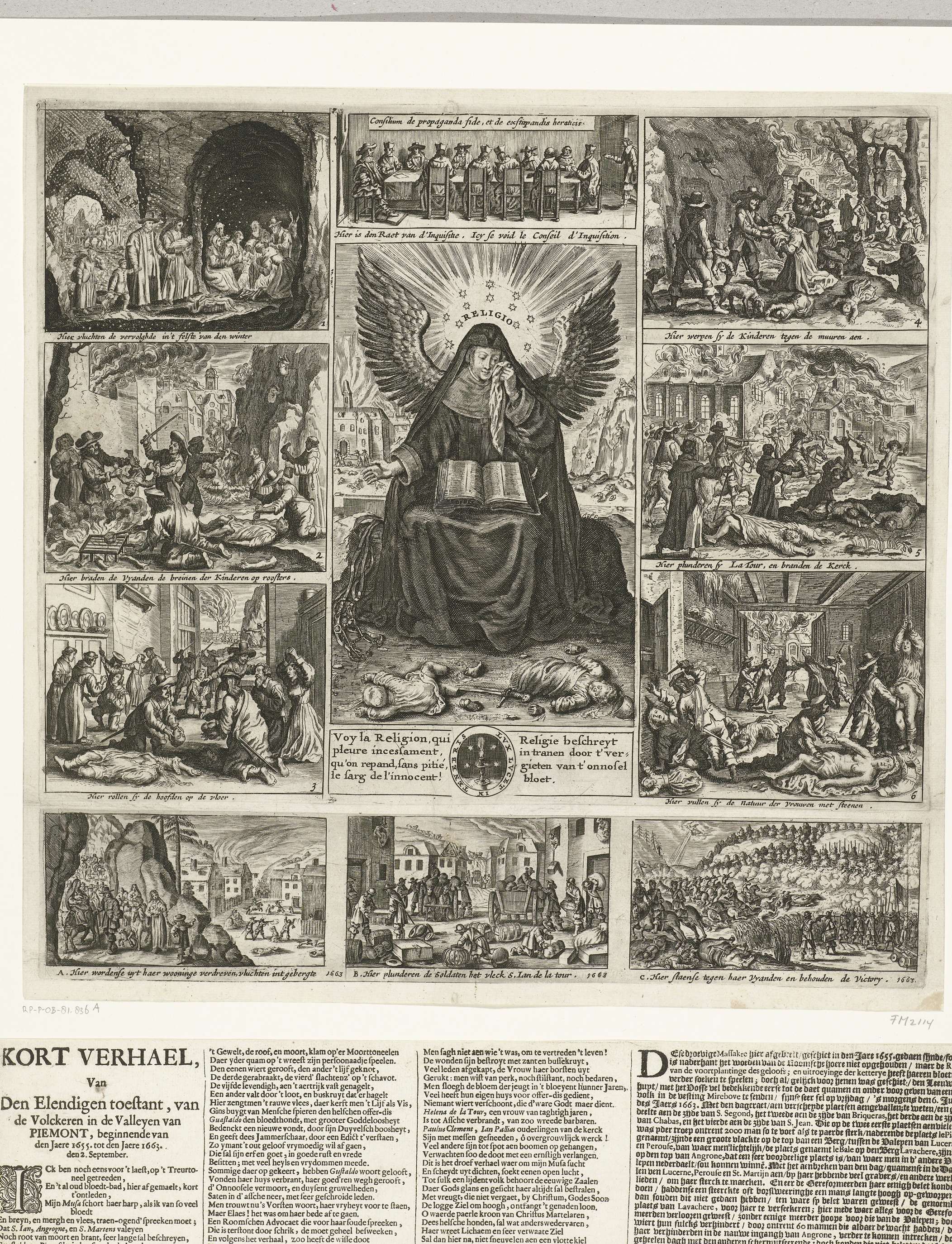 Vervolging van de Waldenzen in de Piemonte gedurende de jaren 1655-1663, op instignatie van Inquisitie en de Jezuïeten. Centraal de huilende personificatie van het Geloof (Religio), omringd door zeven kleinere voorstellingen van de wreedheden en gruwelen bedreven tegen de bevolking in het jaar 1655, genummerd 1-6. Onder de grote plaat een tweede plaat met drie ...