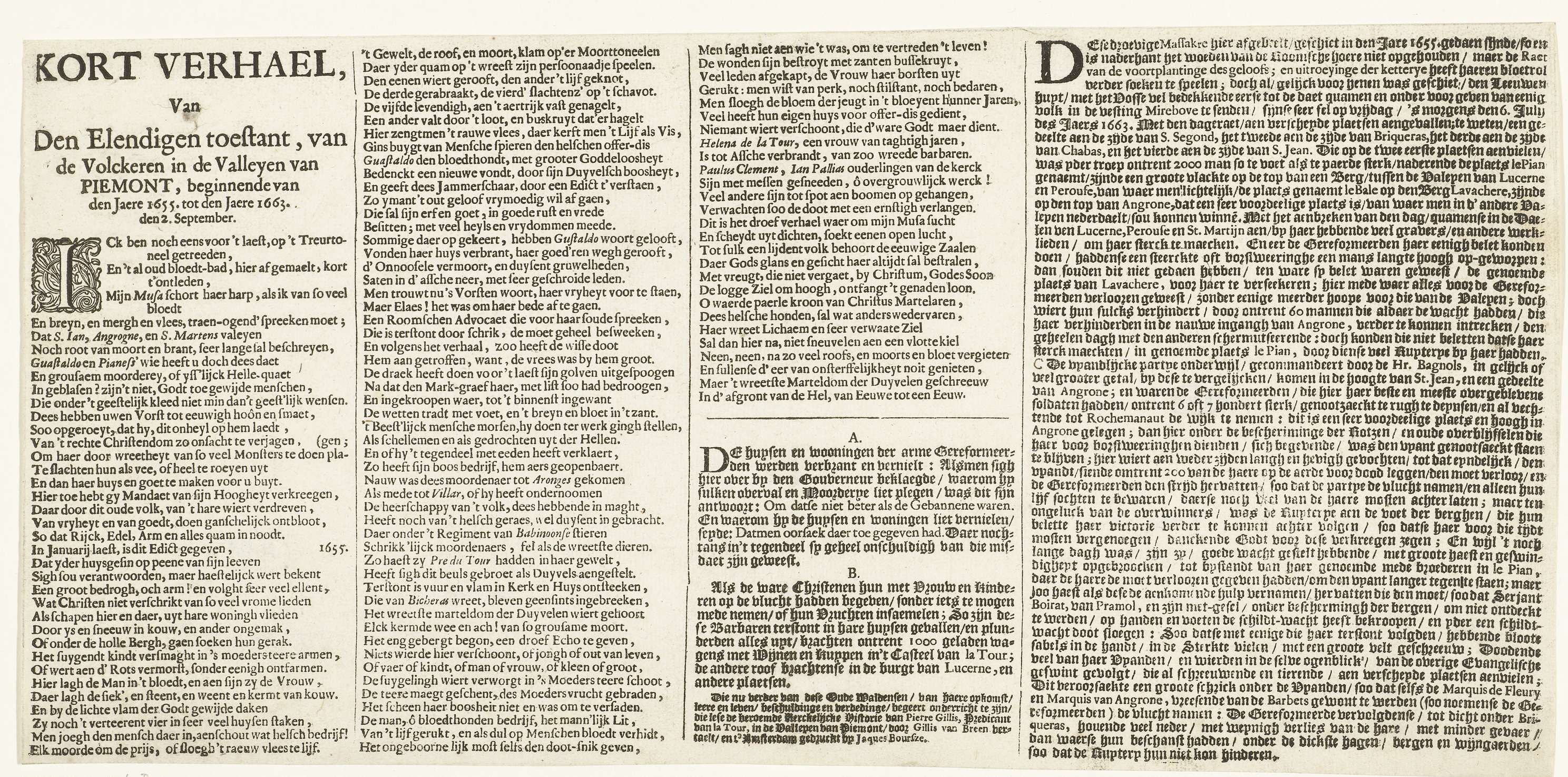 Tekstblad bij de prent van de vervolging van de Waldenzen in de Piemonte, 1655-1663