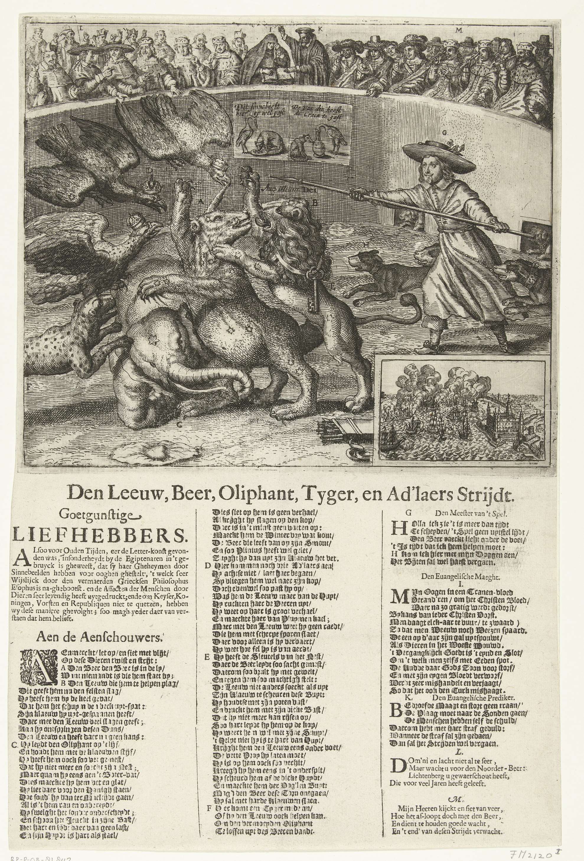 Allegorie op de Noordse Oorlog, ca. 1658. In een arena een gevecht tussen een leeuw (Nederland), beer (Zweden), olifant (Denemarken), een tijger en drie adelaars (Polen, Pruisen en het Duitse Rijk). Het gevecht wordt aangestuurd door Cromwell met zijn honden. De Europese vorsten kijken als publiek toe, in het midden de evangelische maagd en de ...