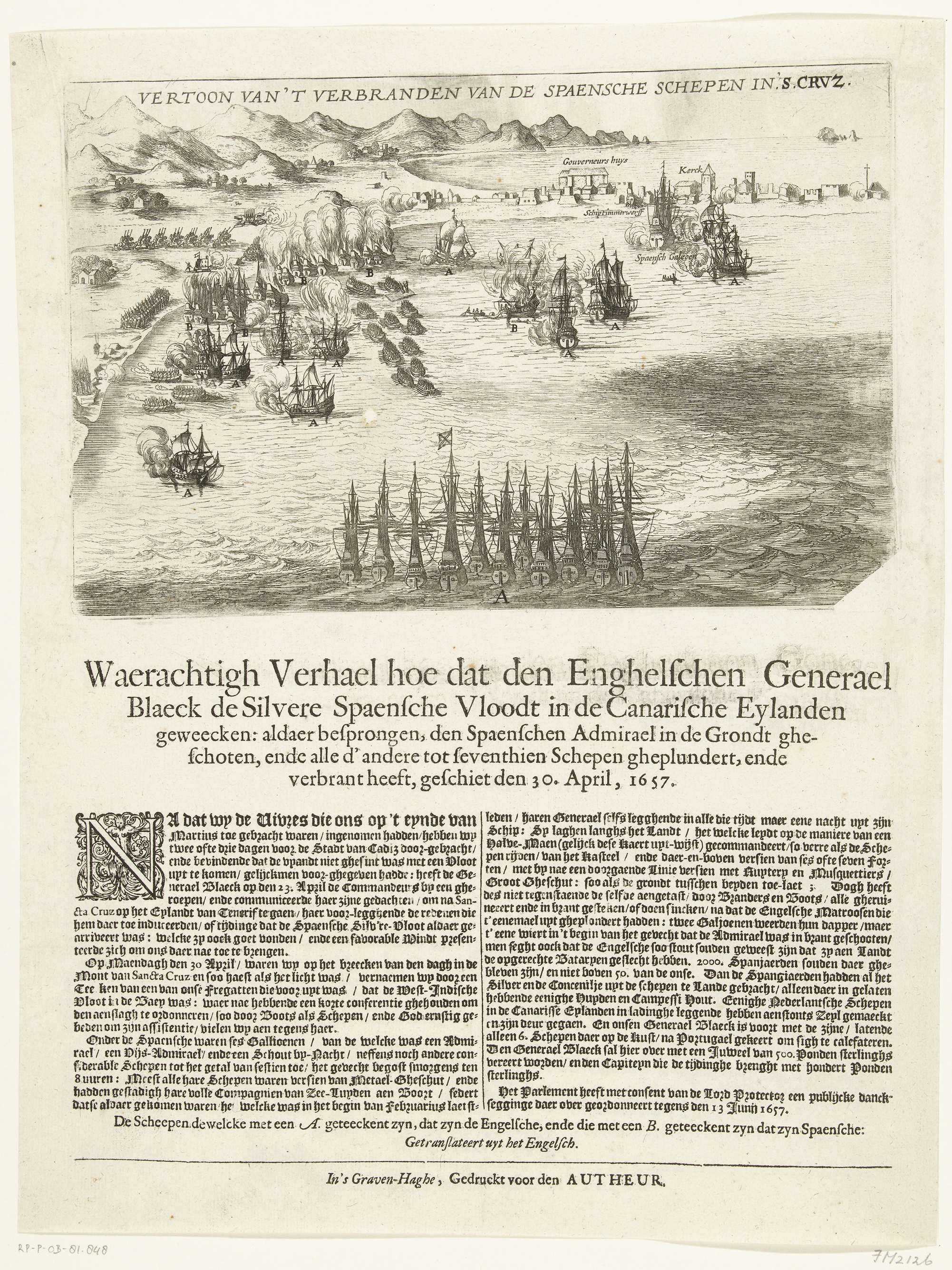 Verovering en vernietiging van de Spaanse zilvervloot door de Engelse vloot onder admiraal Robert Blake bij Santa Cruz de Tenerife op de Canarische eilanden, 30 april 1657. Op het blad is onder de plaat een tekst gedrukt van 2 kolommen in het Nederlands, vertaald uit het Engels. Waarschijnlijk is voor de prent een oude plaat ...