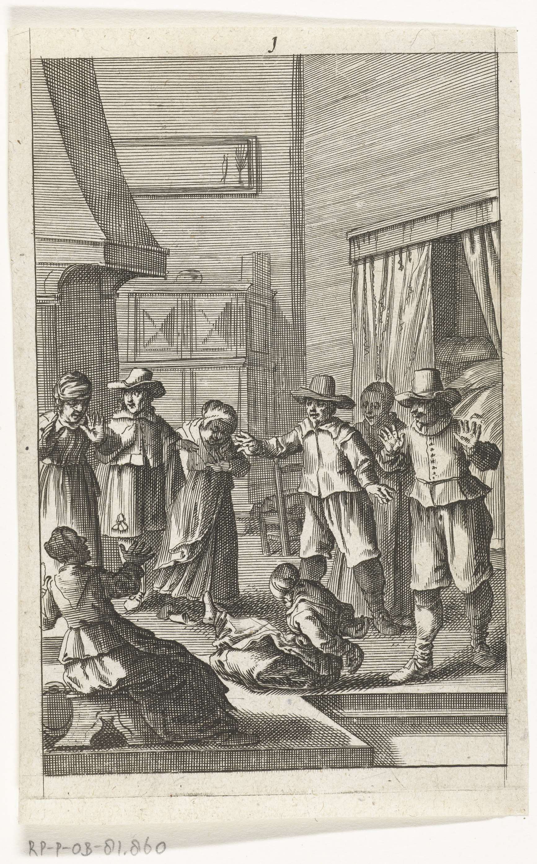 Interieur met een persoon lijdend aan een vorm van vallende ziekte of waanzin, geïnterpreteerd als bezetenheid of tovernarij. Een vrouw ligt met stuiptrekkingen op de vloer. In dit geval gaat het om gewaande toverij bij een vrouw genaamd Dirkje Gerrits te Haarlem, 1617. Genummerd: 1.