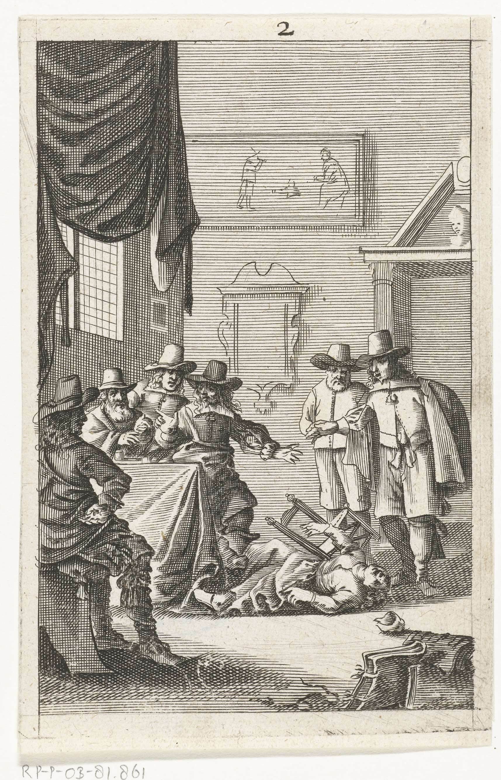 Interieur met een persoon lijdend aan een vorm van vallende ziekte of waanzin, geïnterpreteerd als bezetenheid of tovernarij. Een vrouw valt stuiptrekkend van haar stoel op de vloer. Genummerd: 2.