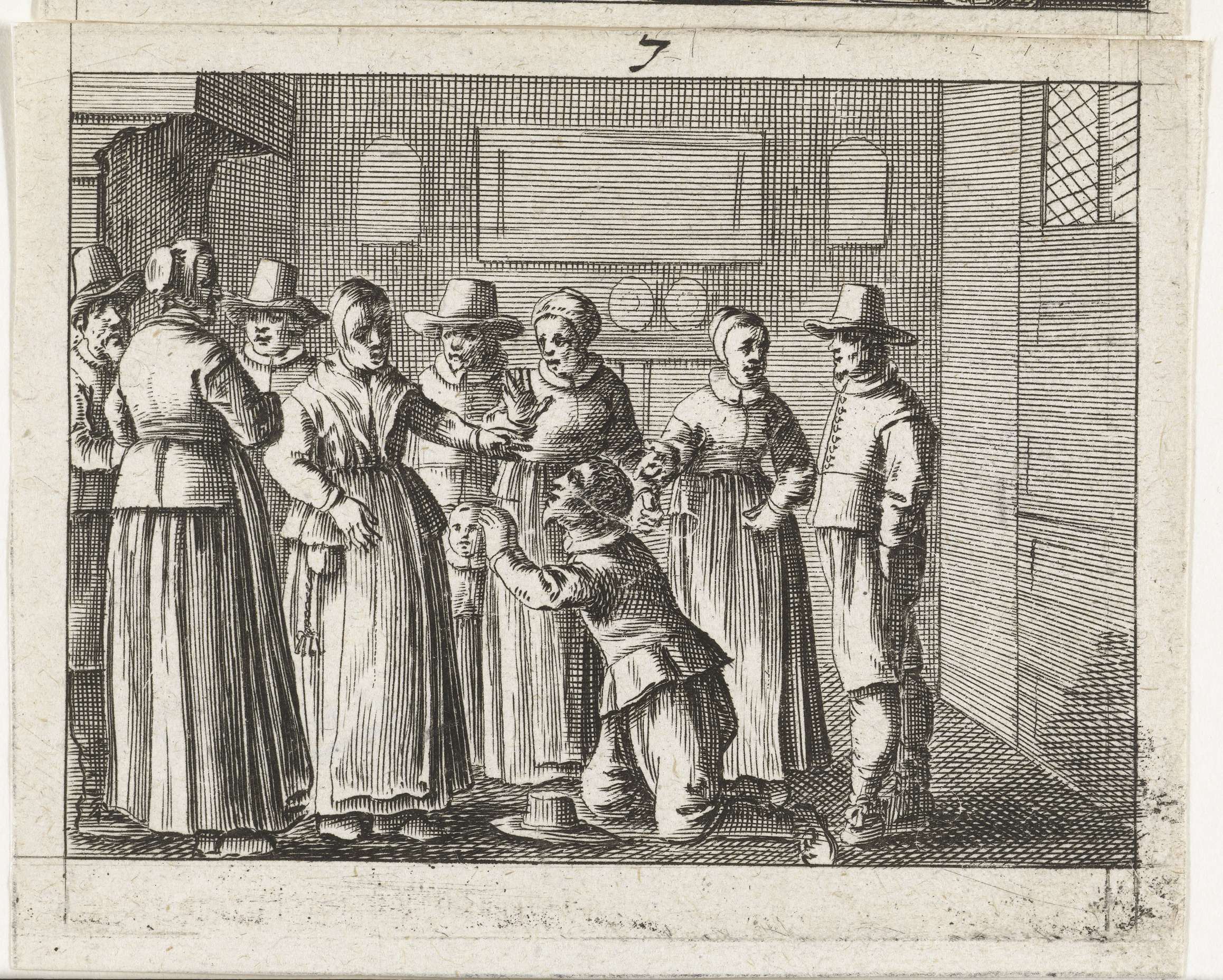 Twee los gesneden voorstellingen van een interieur met een persoon lijdend aan een vorm van vallende ziekte of waanzin, geïnterpreteerd als bezetenheid of tovernarij. Een man op zijn knieën in een groep. Genummerd: 7.
