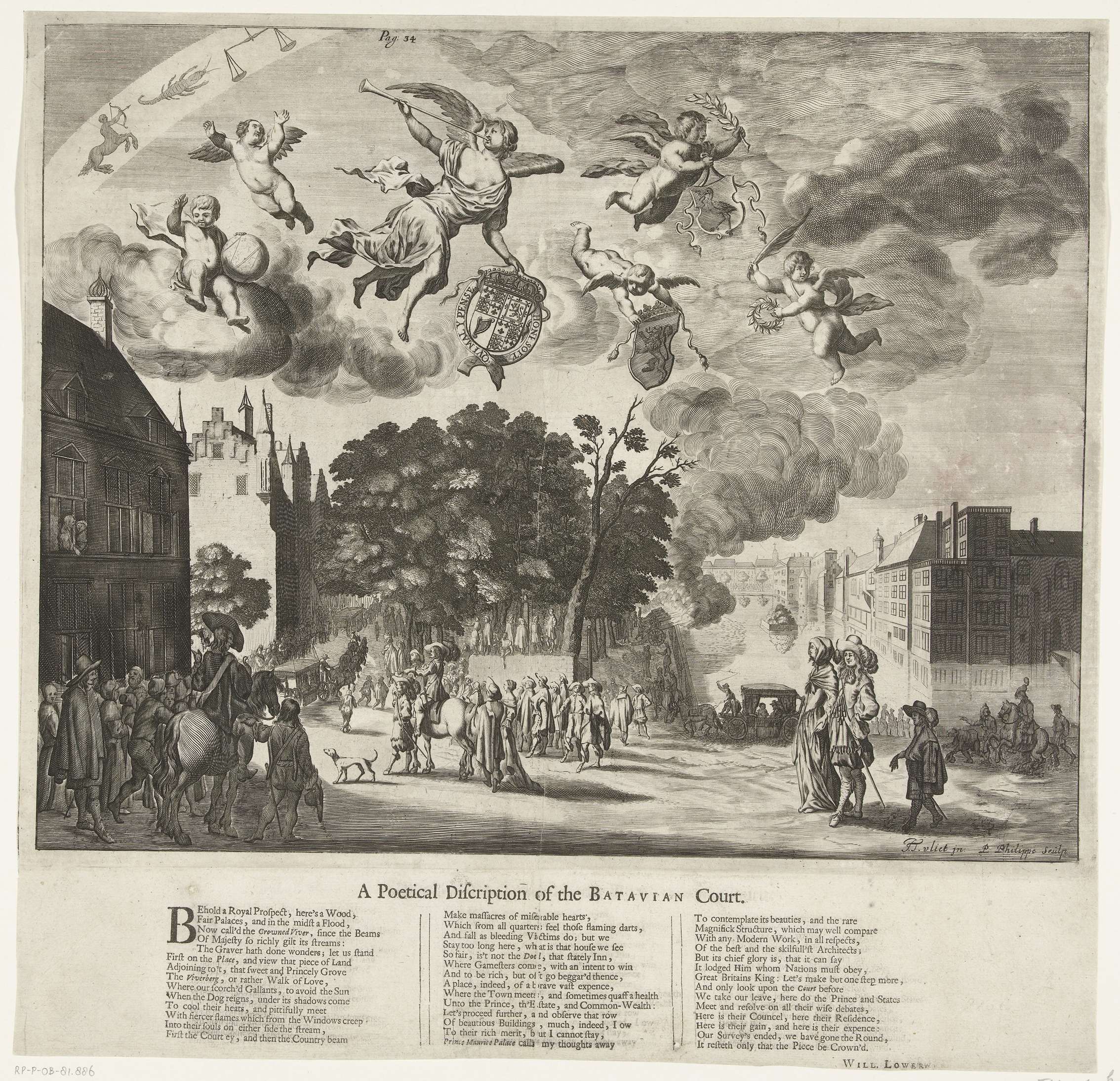 Aankomst van de Engelse koning Karel II vanuit Delft in Den Haag, 25 mei 1660. Episode tijdens zijn rondreis door en vertrek uit de Nederlanden. Aankomst bij de Vijverberg en het Groene Zoodje, bij de Hofvijver worden saluutschoten afgevuurd. In de lucht de Faam en putti met de wapens van de Engelse koning, Holland en ...