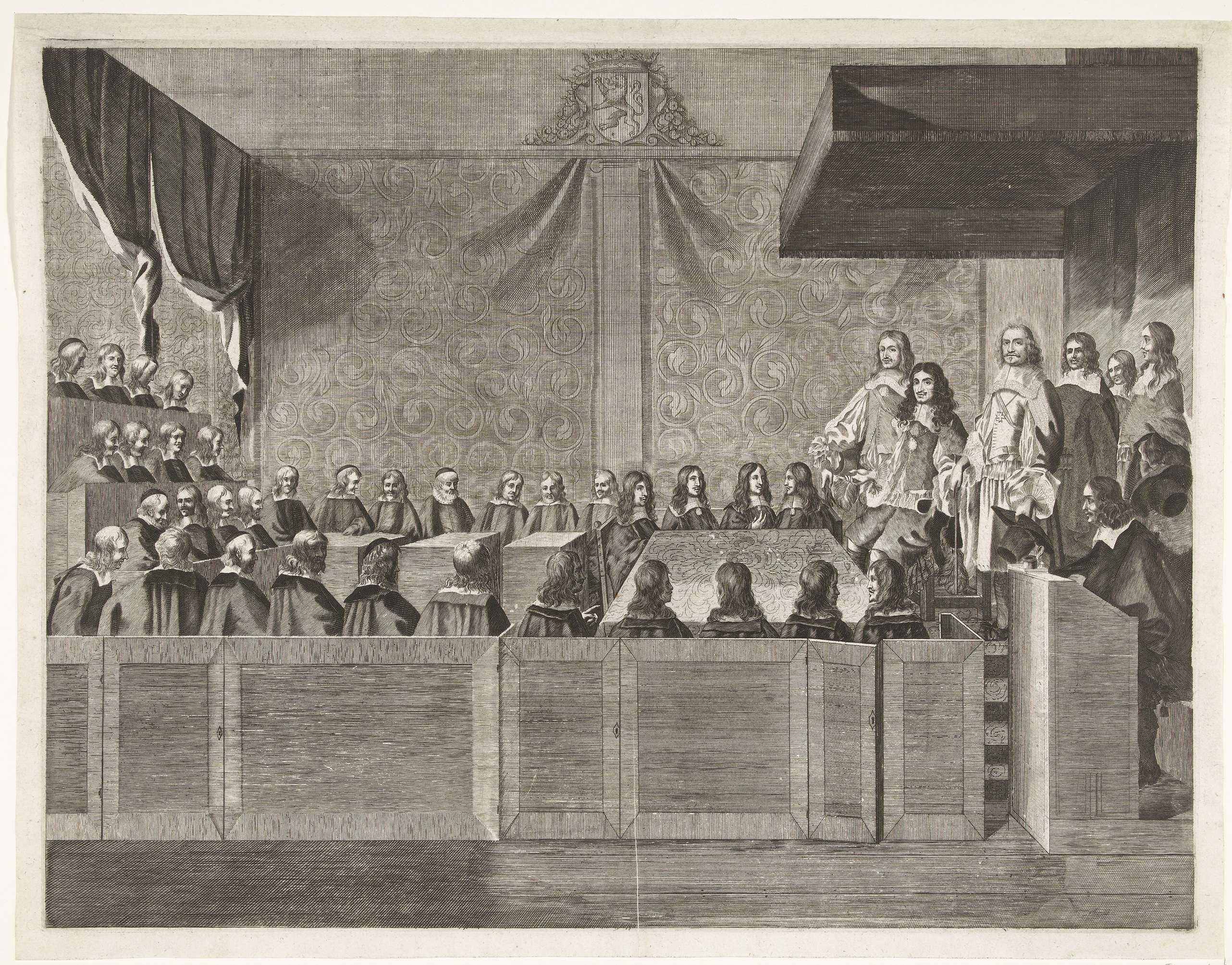 Koning Karel II van Engeland spreekt de Staten-Generaal toe, 1 juni 1660. Episode tijdens zijn rondreis door en vertrek uit de Nederlanden. De koning rechts met begeleiders zittend onder een baldakijn, met de voeten onder de tafel van de op een gesloten zitbank zittende raadsheren. Met vele andere gezichten, op de muur het wapen van ...