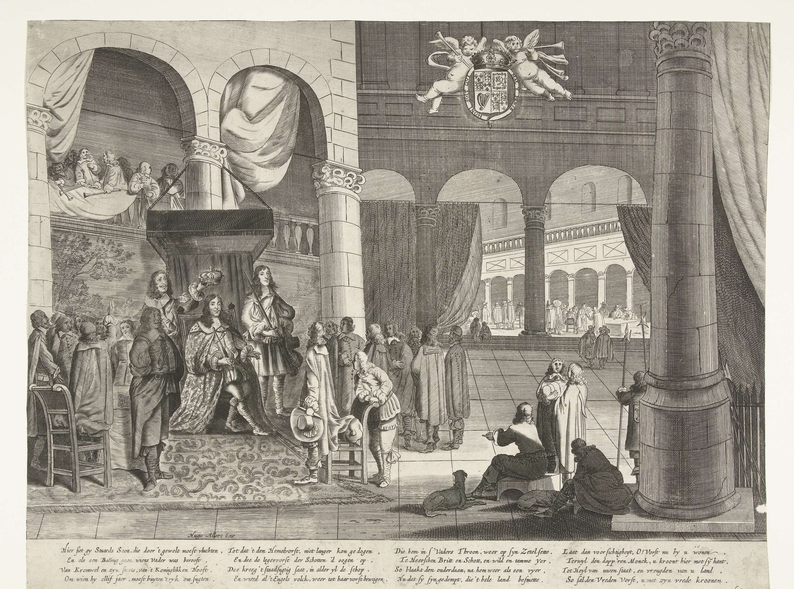 Karel II door admiraal Monck tot koning van Engeland gekroond in Westminster Abbey, 23 april 1661. Open hal of zuilengang in een paleis met de koning zittend op zijn troon. Bovenaan twee engelen met het wapen van Engeland. In het onderschrift vier vierregelige verzen.