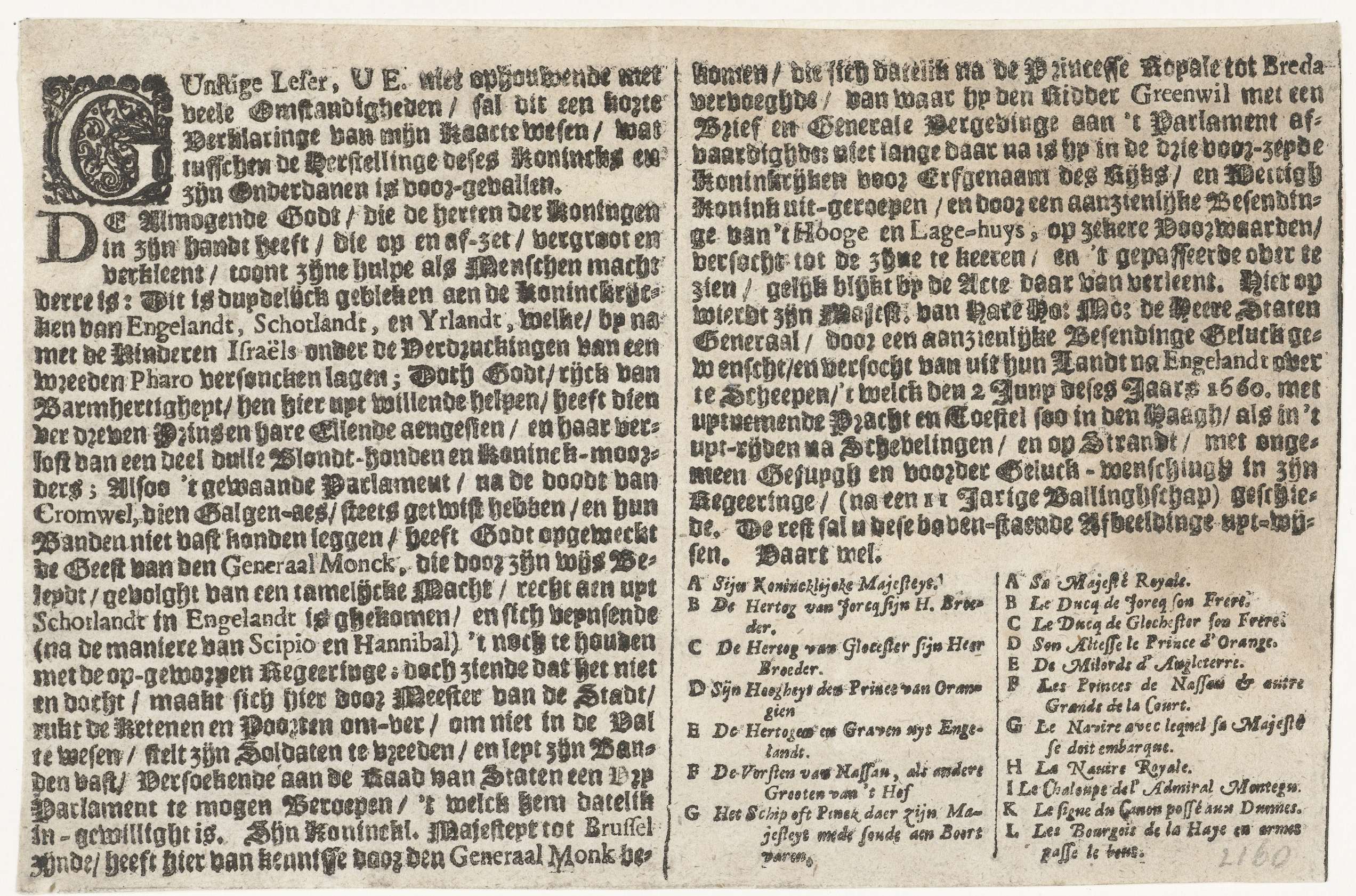 Tekstblad bij de prent met het vertrek van de Engelse koning Karel II vanuit Scheveningen naar Engeland, 2 juni 1660. Tekstin twee kolommen in het Nederlands, met de legenda's A-G en A-L in het Nederlands en Frans.