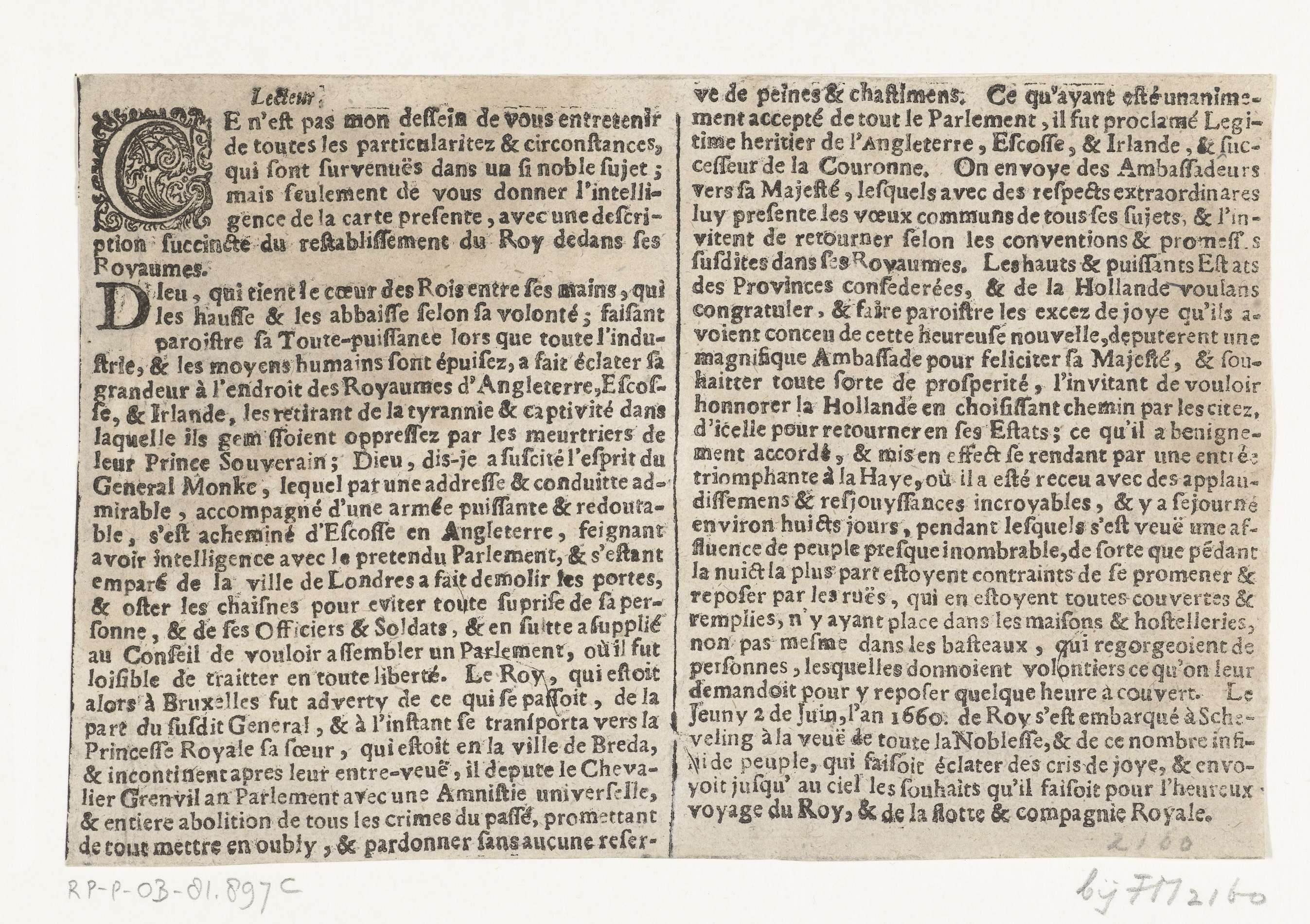 Tekstblad bij de prent met het vertrek van de Engelse koning Karel II vanuit Scheveningen naar Engeland, 2 juni 1660. Tekstin twee kolommen in het Frans.
