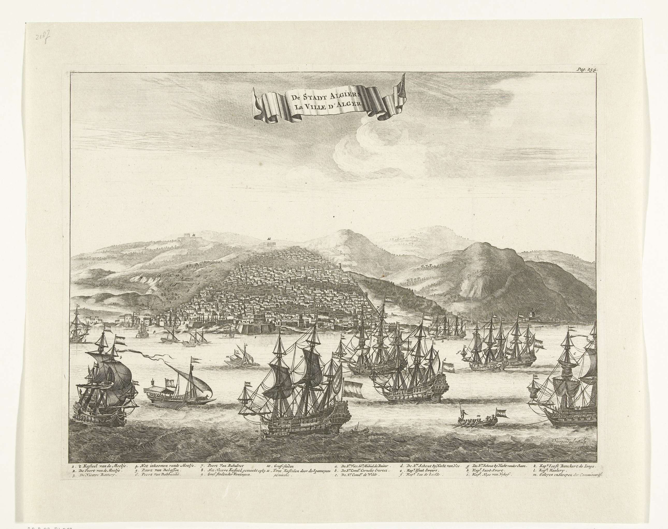 Gezicht op Algiers met de Staatse vloot onder admiraal Michiel Adriaenszoon de Ruyter voor anker liggend bij de stad ten tijde van de vredesonderhandleingen, 16 november 1662. Gemerkt rechtsboven: Pag. 254. In het onderschrift de legenda 1-11 en a-m.