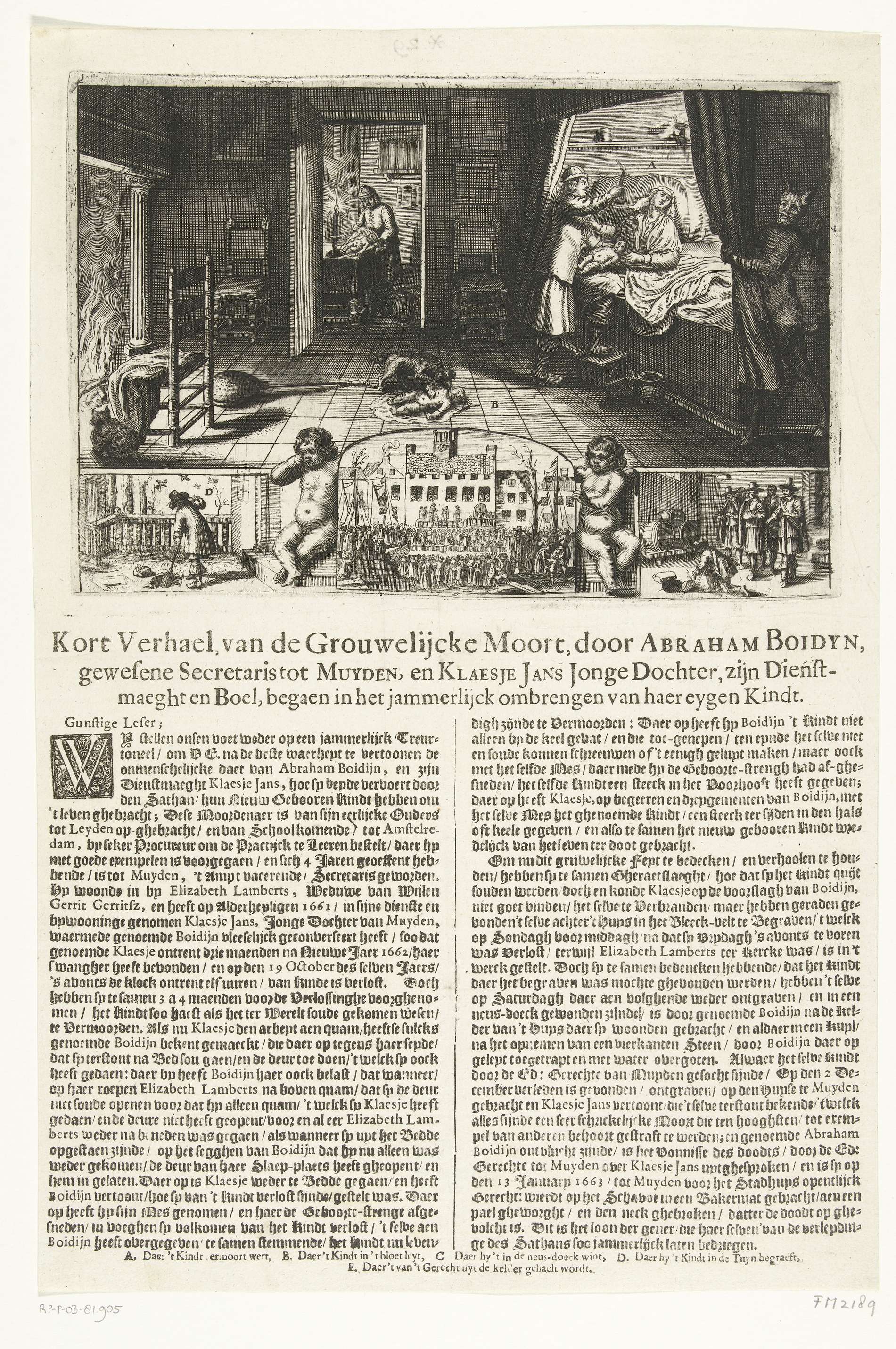 Het vermoorden, begraven en opgraven door Abraham Boedijn en zijn dienstmaagd en bijzit Klaesje Jans van hun eigen kind, Muiden 19 oktober 1662. Grote voorstelling van de geboorte en het ombrengen van het kind, de duivel trekt het gordijn van de bedstede. Daaronder drie kleinere voorstellingen van het begraven en weer opgraven van het kinderlijkje ...