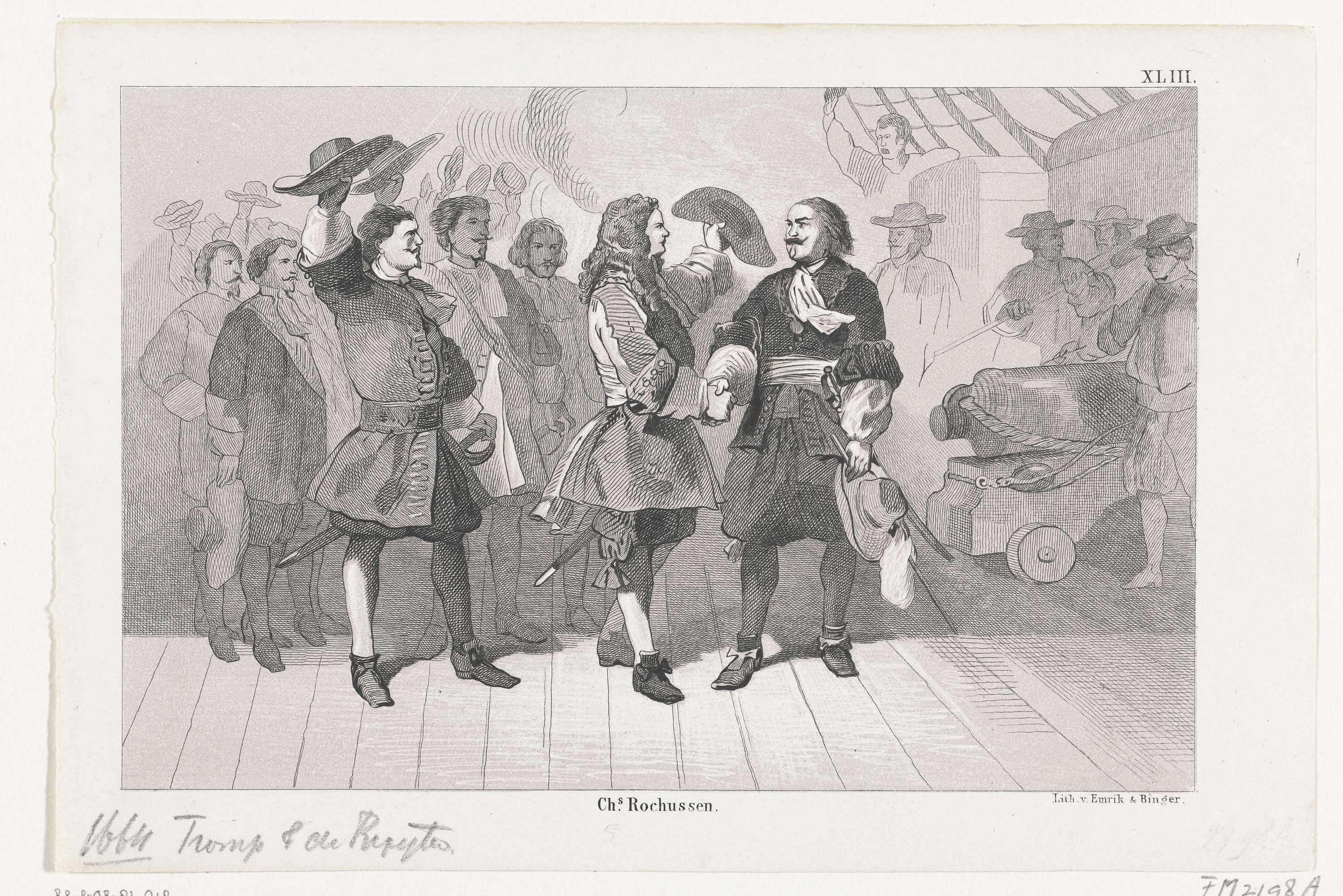 Cornelis Tromp ontvangt Michiel Adriaenszoon de Ruyter aan boord van een schip, 1664.