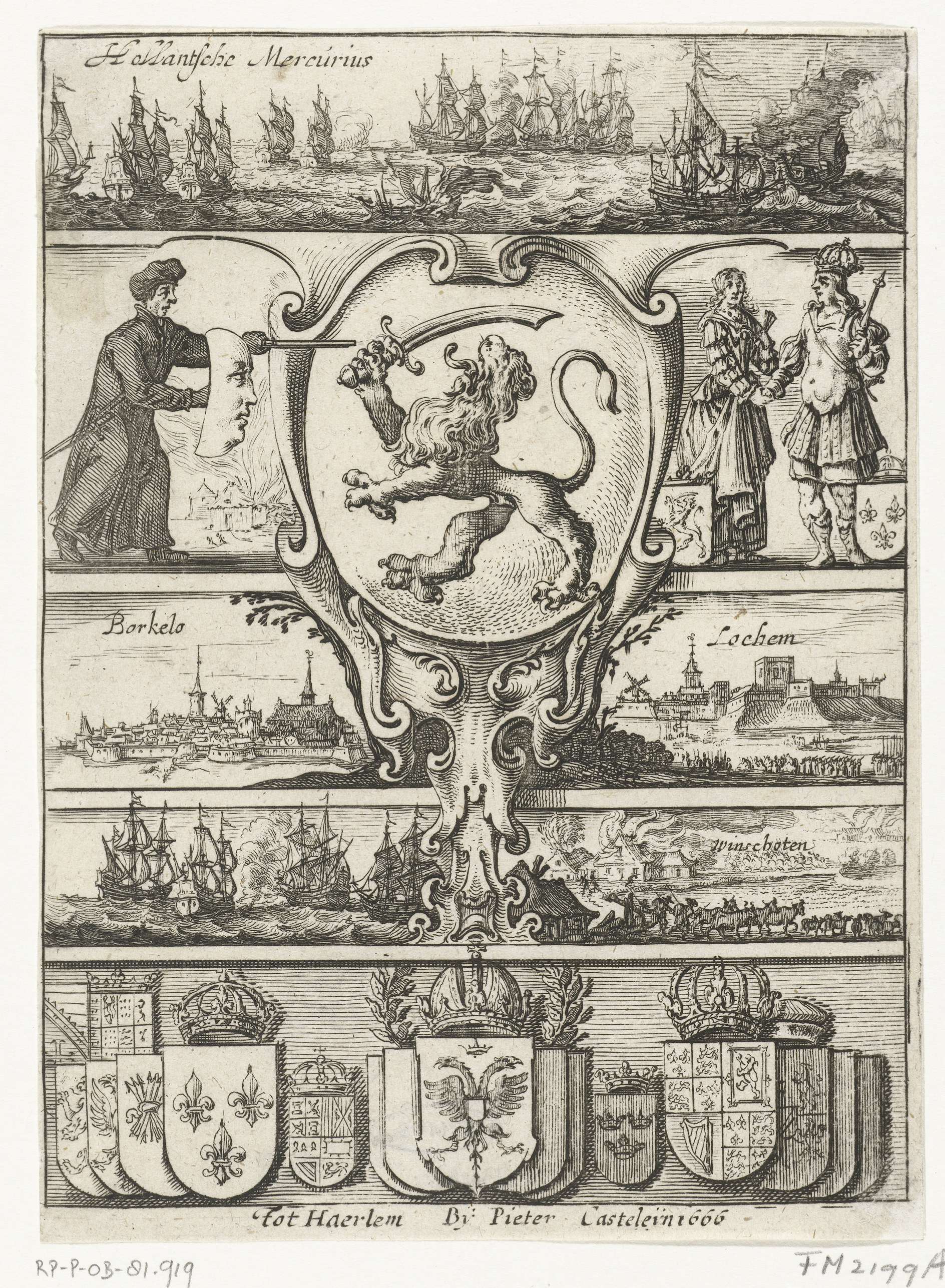 Titelblad voor de Hollandsche Mercurius van het jaar 1665 met centraal de Hollandse Leeuw. Hieromheen kleine scènes met gebeurtenissen uit het het jaar 1665, onder andere te Borculo, Lochem en Winschoten.