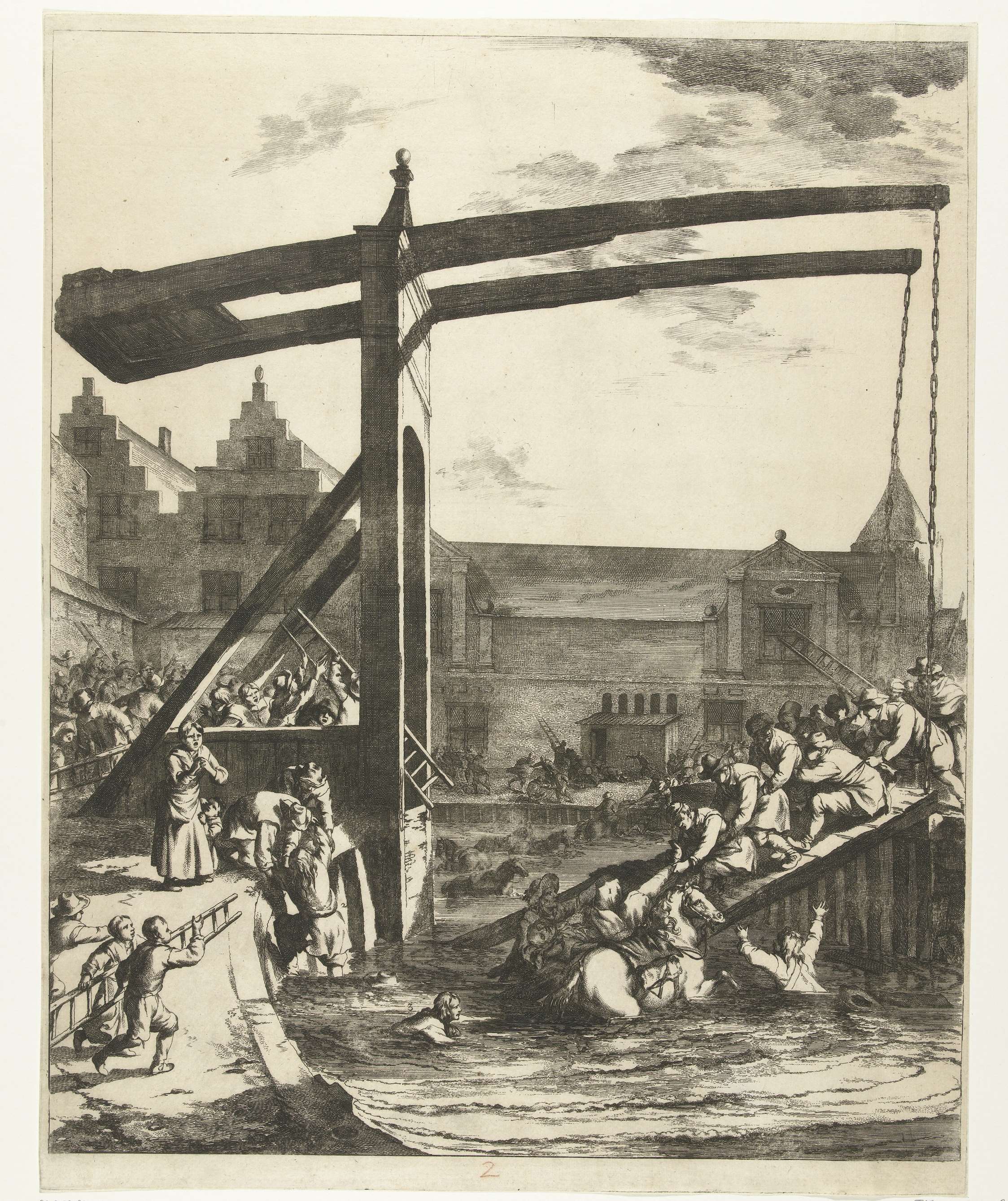 Redding van graaf Johan Maurits na het ongeluk op de brug van Franeker, 1665, 6 januari 1665. De ophaalbrug waar de graaf met zijn gevolg overheen reed is ingestort. De graaf wordt uit het water gehaald, omstanders komen met ladders aangesneld. De figuren in de voorstelling genummerd 1-3.