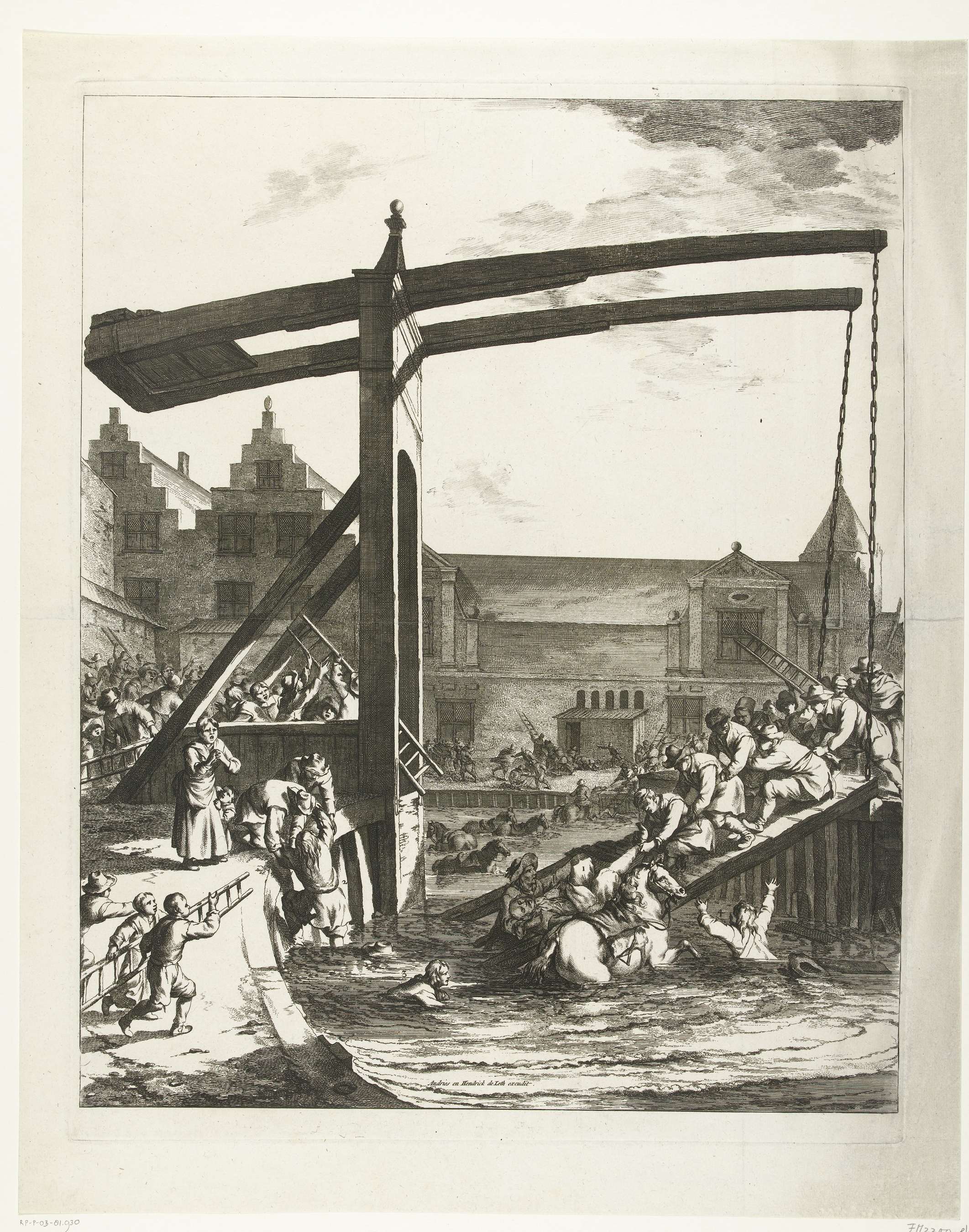 Redding van graaf Johan Maurits na het ongeluk op de brug van Franeker, 1665, 6 januari 1665. De ophaalbrug waar de graaf met zijn gevolg overheen reed is ingestort. De graaf wordt uit het water gehaald, omstanders komen met ladders aangesneld. De figuren in de voorstelling genummerd 1-3.