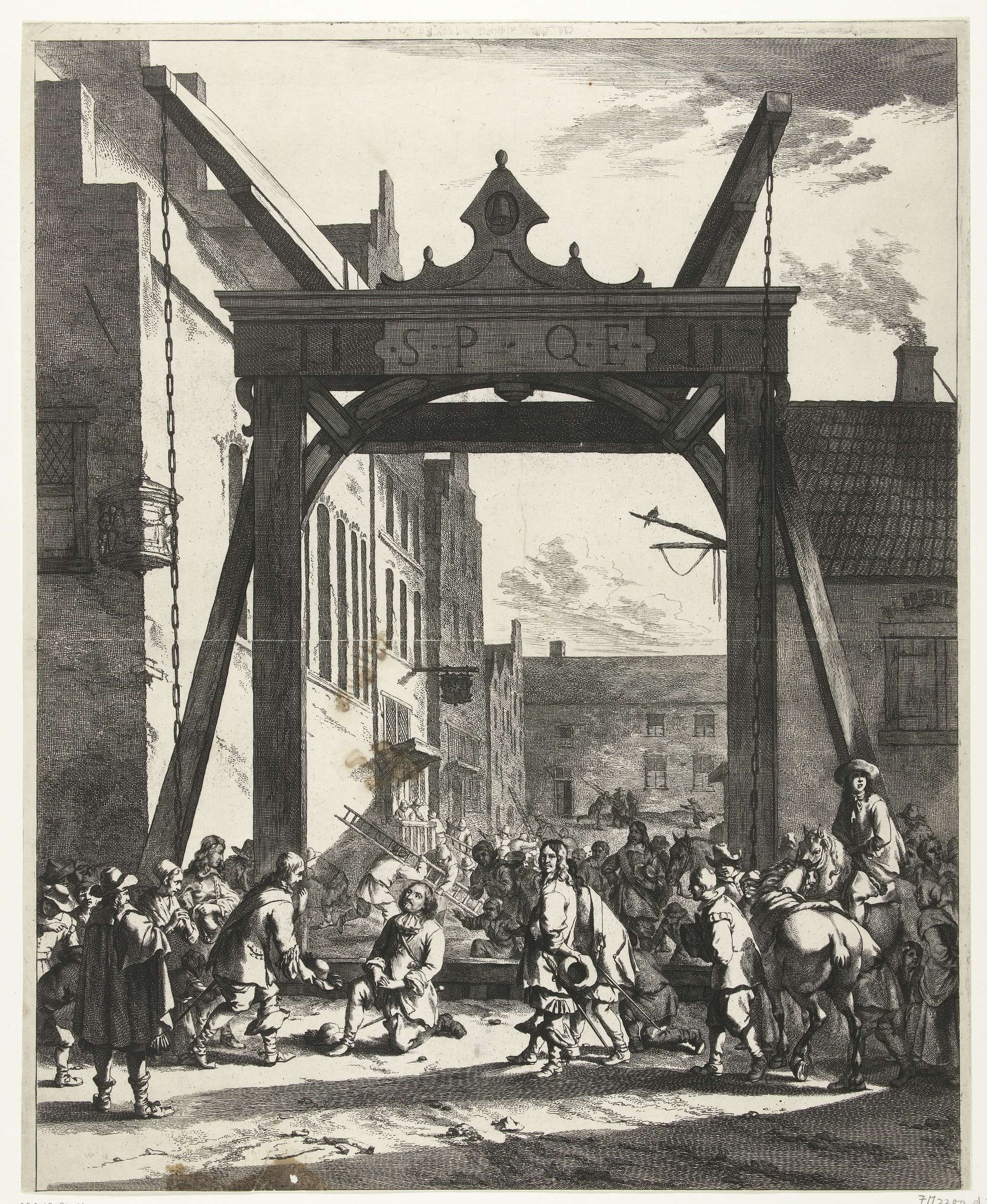Dankzegging door graaf Johan Maurits na zijn redding na het ongeluk op de brug van Franeker, 1665, 6 januari 1665. De graaf knielt bij de ingestorte ophaalbrug.