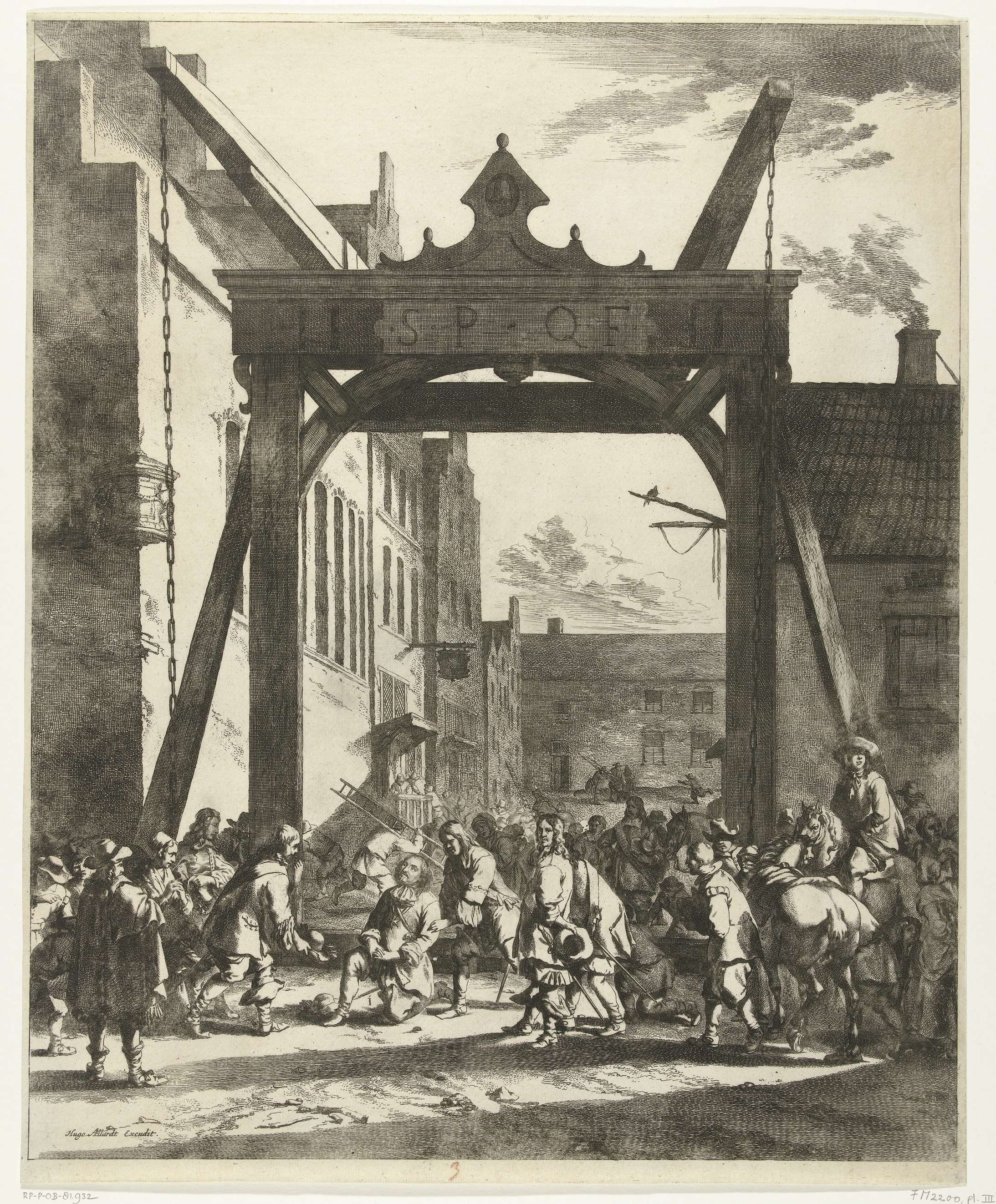 Dankzegging door graaf Johan Maurits na zijn redding na het ongeluk op de brug van Franeker, 1665, 6 januari 1665. De graaf knielt bij de ingestorte ophaalbrug.